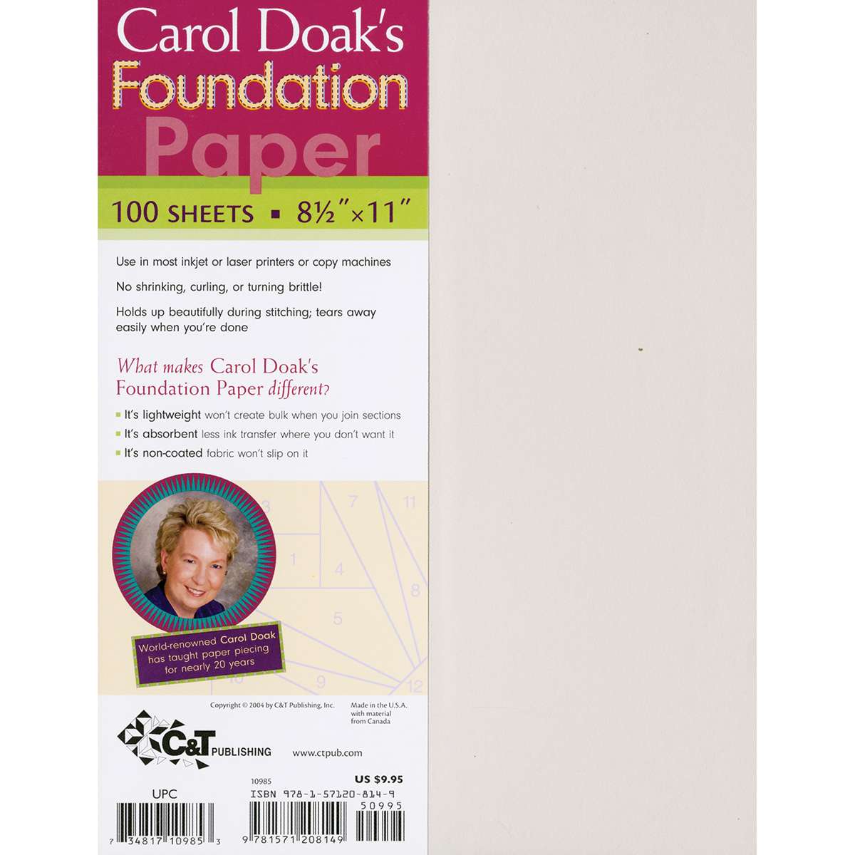 Print or copy your foundation patterns onto this special paper, which can be used in most inkjet or laser printers or copy machines. There’s no shrinking, curling or turning brittle. The paper holds up beautifully during stitching and tears away easily. 100 sheets 8½" x 11".