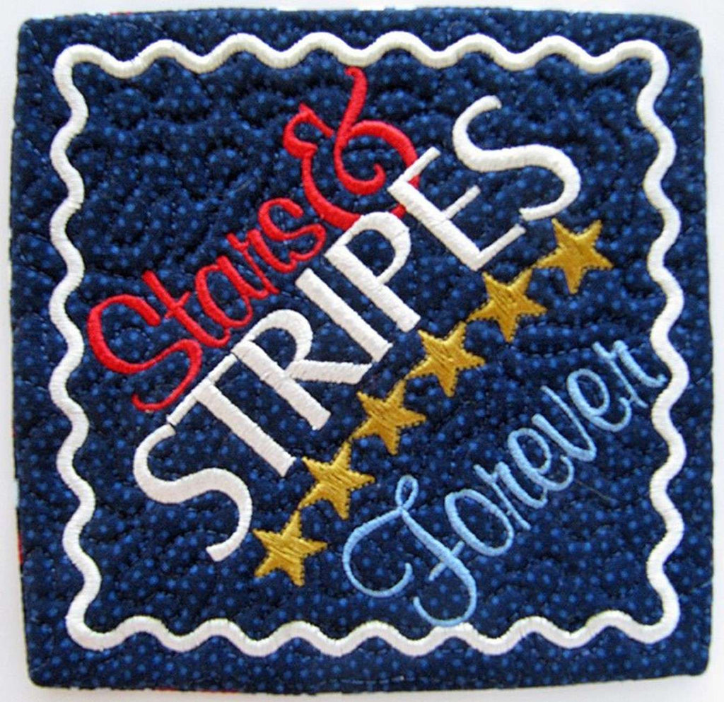 Give four cheers for this great land of ours and add flare to your Independence Day celebration with this foursome of Made in the Hoop patriotic coasters! Hoop Size: 5 3/4 inches x 5 3/4 inches. Formats: ART7, ART8, DST, EMB, EXP, HUS, JEF, PCS, PES, SEW, SHV, VP3 & XXX. Finished Size: 5 inches x 5 inches.
