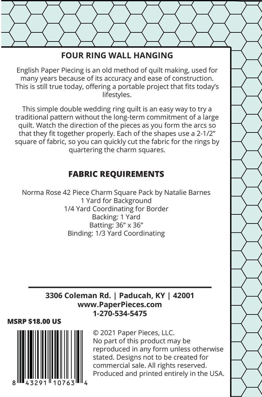 This simple double wedding ring quilt is an easy way to try a traditional pattern without the long-term commitment of a large quilt. Watch the direction of the pieces as you form the arcs so that they fit together properly. Each of the shapes uses a 2-1/2" square of fabric, so this pattern works well with a Charm Square Pack or Mini Charm Square Pack. Shown using the Norma Rose Charm Square Pack by Natalie Barnes for Windham.Finished Dimensions 33" x 33". Precut Friendly.