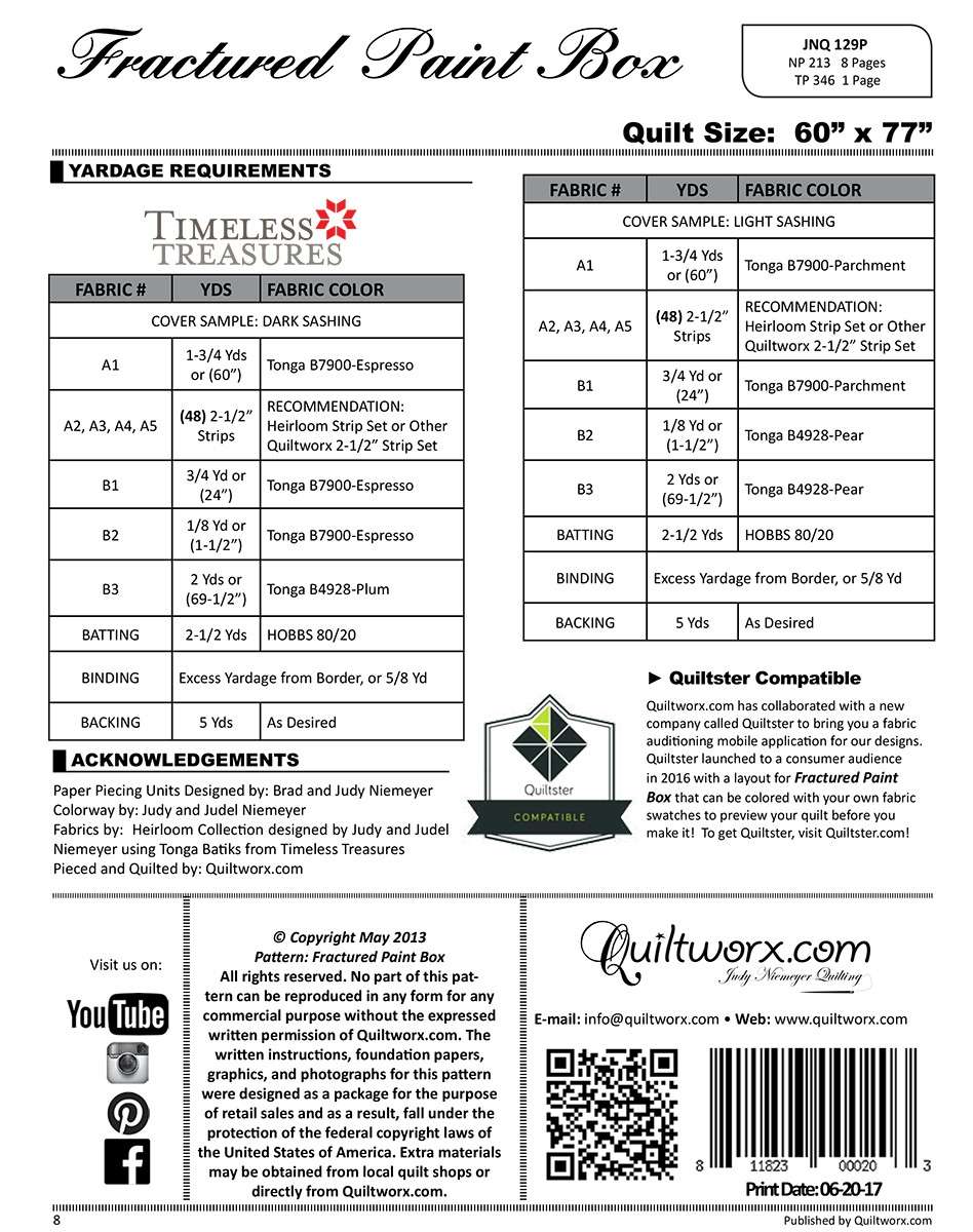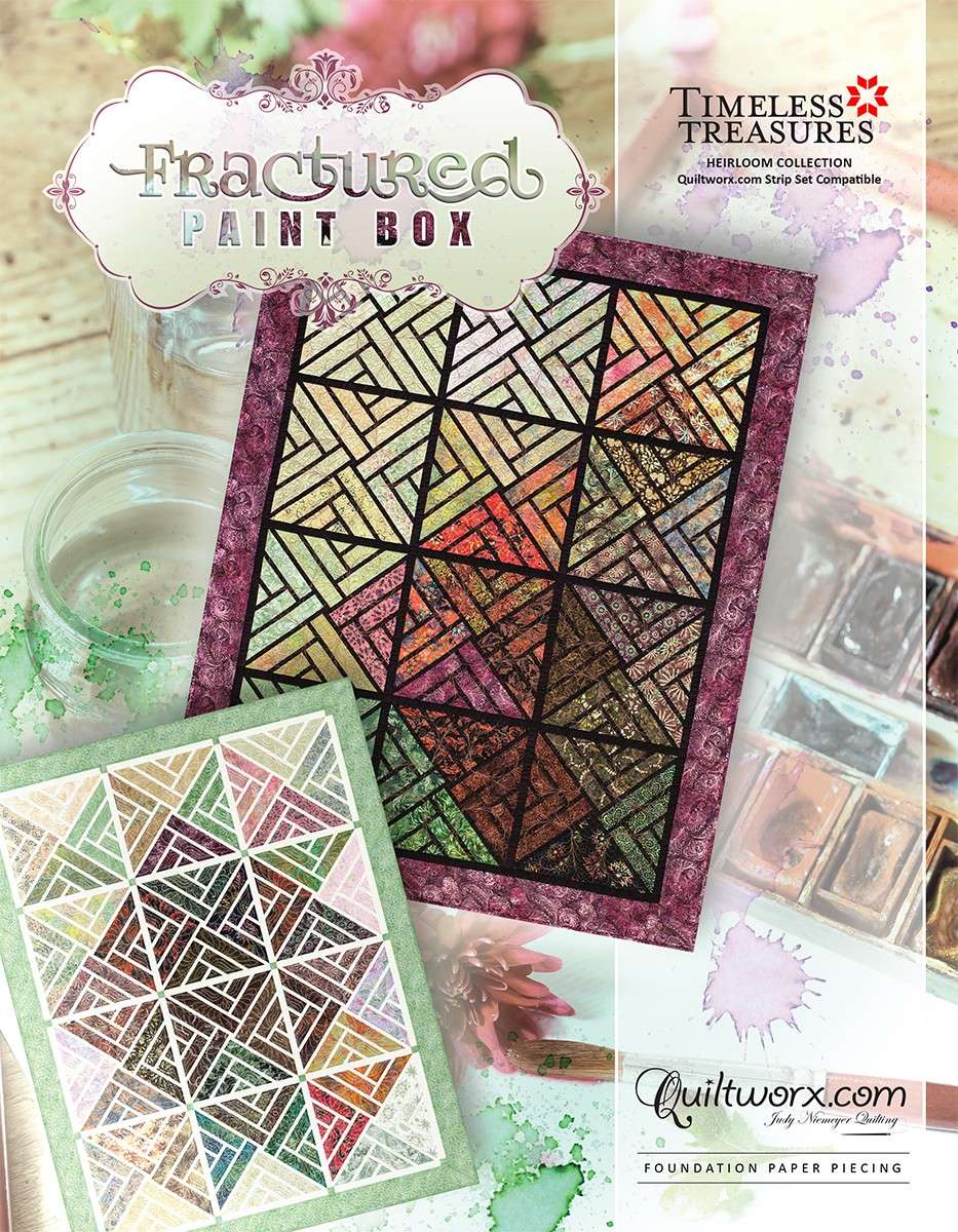 Fractured Paint Box is a foundation paper pieced pattern and is great for beginners. The project is fast, uses only one foundation block, and employs simple cutting techniques. Pattern Includes: Instructions, Cover Sheet, Yardage Information, Foundation Papers. Quiltster compatible. Finished Size: 60 inches x 70 inches. Fabric not included.
