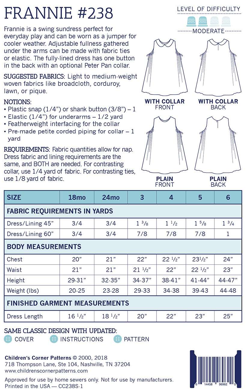 Frannie is a swing sundress perfect for everyday play and can be worn as a jumper for cooler weather. Adjustable fullness gathered under the arms can be made with fabric ties or elastic. The fully-lined dress has one button in the back with an optional Peter Pan collar. Fabric not included.