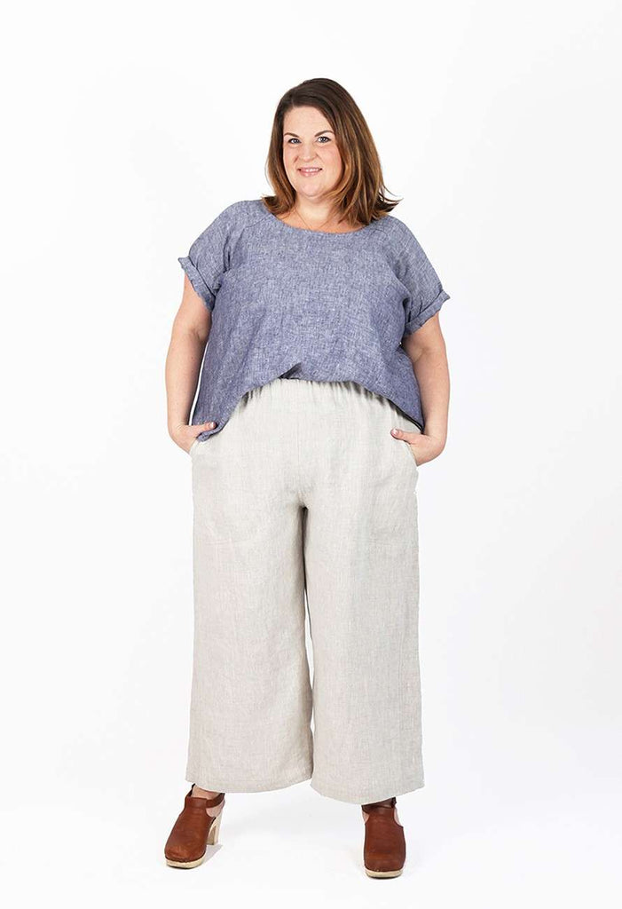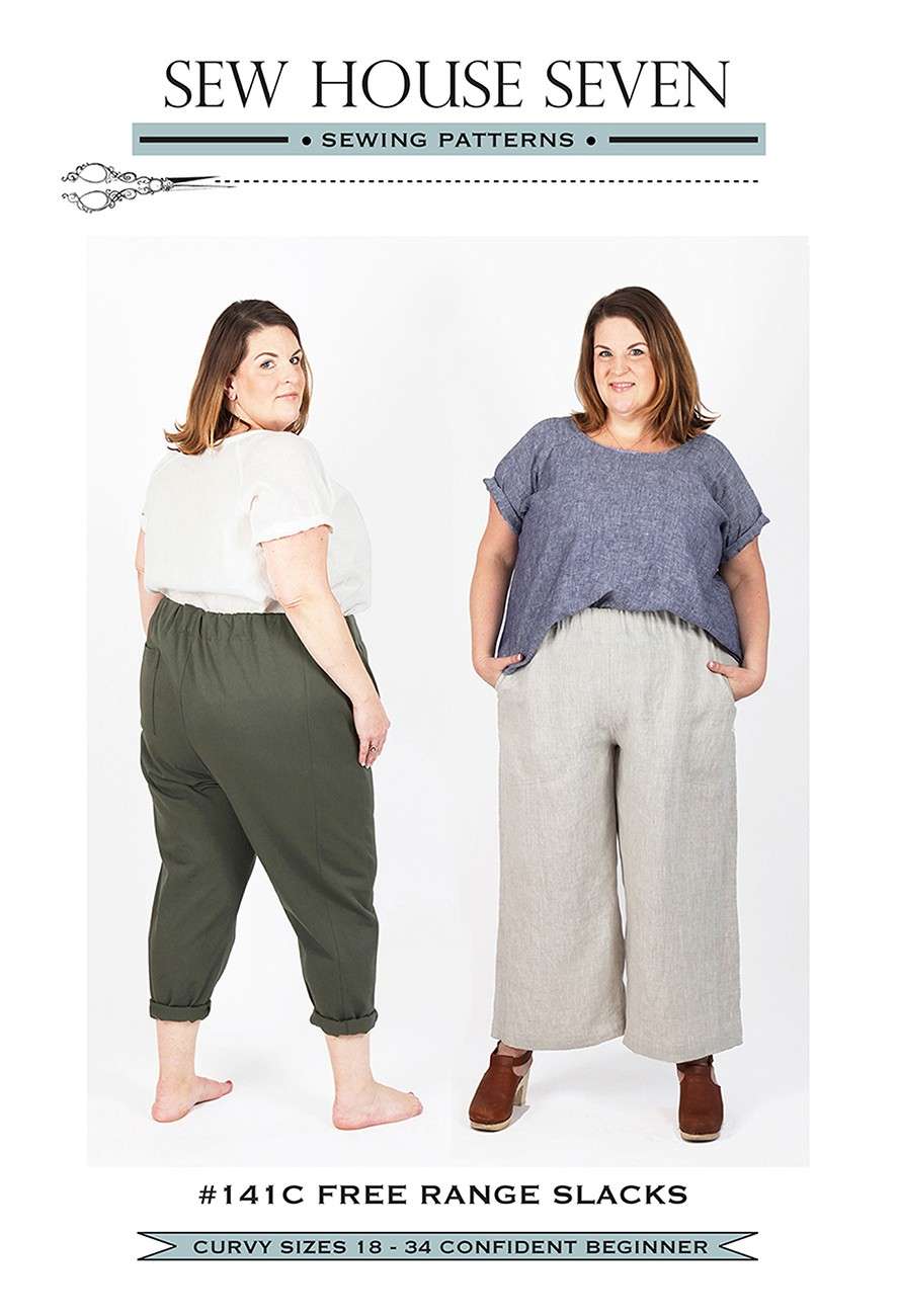An elastic waist pants pattern that has a tapered leg version and a straight, wide leg version. Both versions have an elastic waist, high rise, front pockets, side panels and optional back pockets. Curvy Sizes 18 - 34. Confident Beginner level