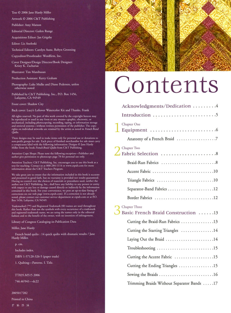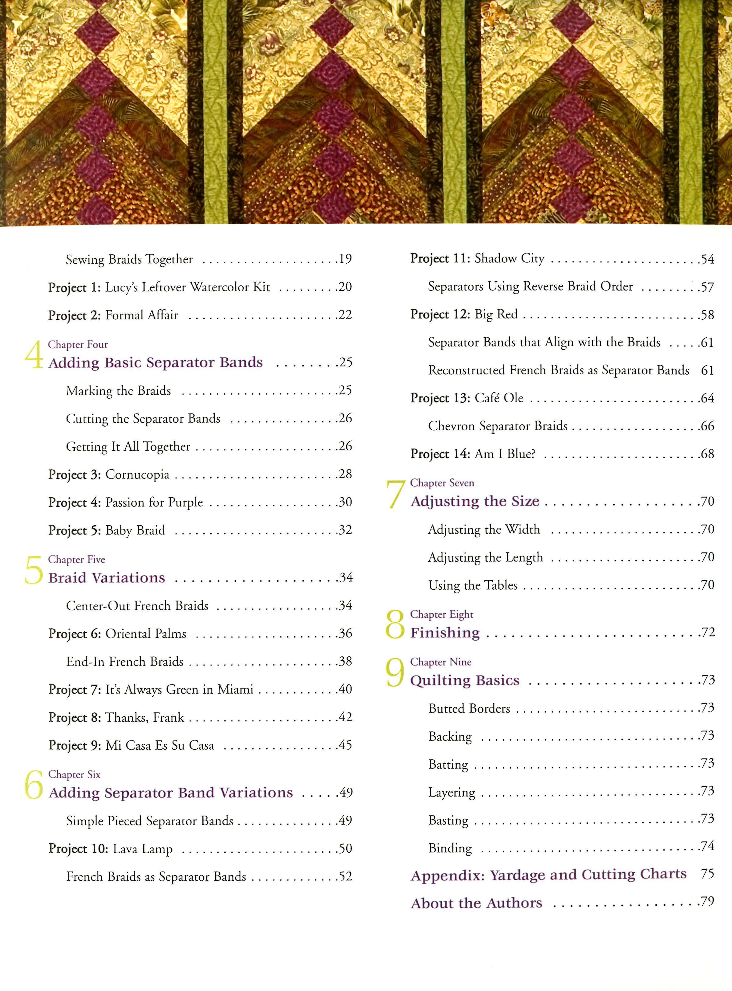 With both a new way to make quilts and a new approach to color for quilters, French Braid Quilts teaches crafters to identify color values and use them to create intriguing braided pieces. Fourteen projects, from wall hangings to bed quilts, are just the beginning of the great looks sewers can achieve. Uses Creative Grids CGRBR4, CGR24 and CGRBR6.