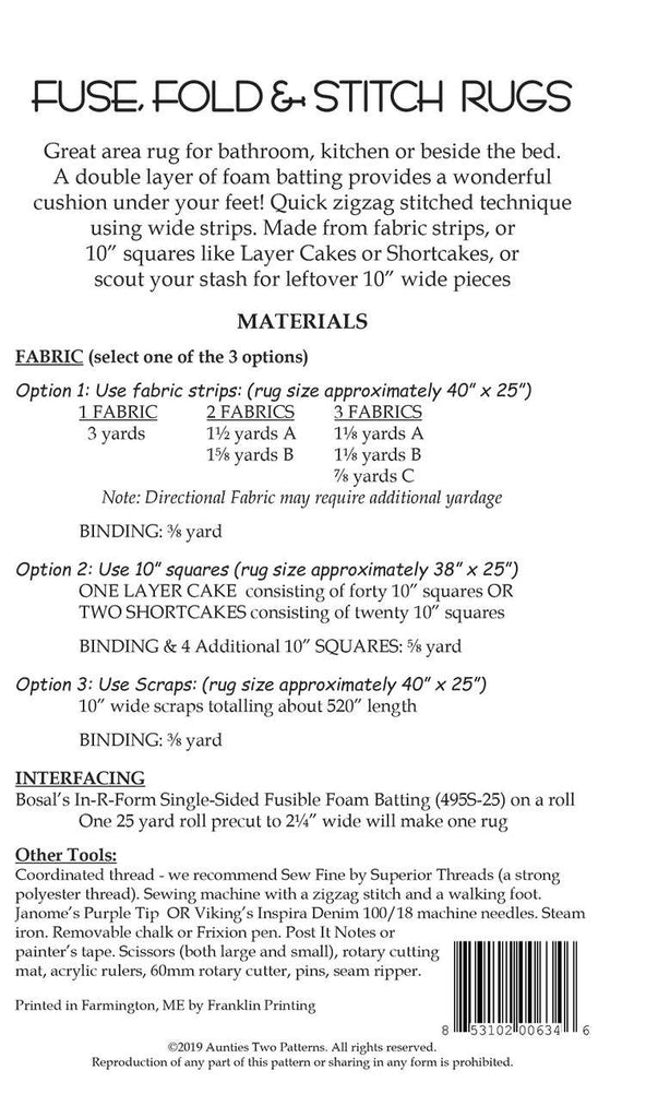 Rugs for bathroom, kitchen, bedroom. Quick zigzag stitched technique using Layer cakes or wide strips.