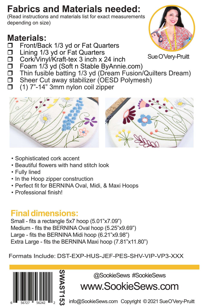 This femanine flower bag is made entirely In-the-Hoop with your embroidery machine. The 3mm zipper is added right inside the hoop, it is completely lined, features cork, and a garden full of hand embroidered looking flowers. Ready to stitch in four sizes and designed with the Bernina hoops in mind. Small - fits a rectangle 5in x 7in hoop- 5.01in x 7.09in, Medium - fits the Bernina Oval hoop 5.25in x 9.69in, Large - fits the Bernina Midi hoop- 6.21in x 9.98in, and Extra Large - fits the Bernina Maxi hoop: 7.81in x 11.80in.