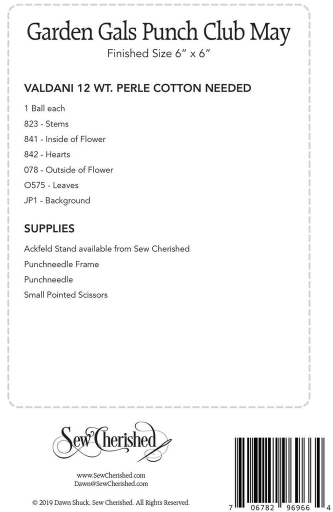 We are very excited about our Garden Gals Punch Needle Club. This design is punched with Valdani Perle Cotton 12. Finished size is 5.5"x5.5" and the design is already stamped on weavers cloth and included with the pattern. The stand is custom designed to fit with this series. Be sure to look for the other months of this series.
