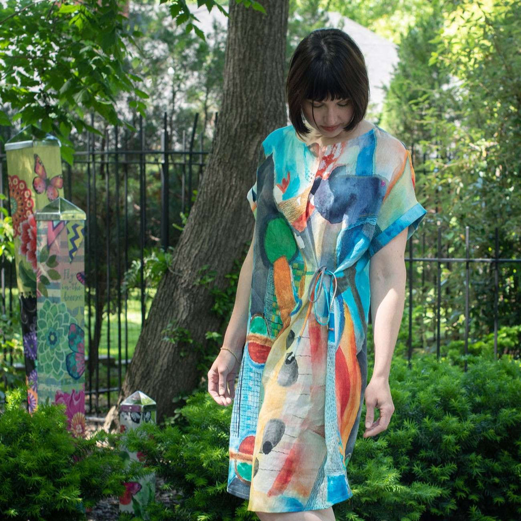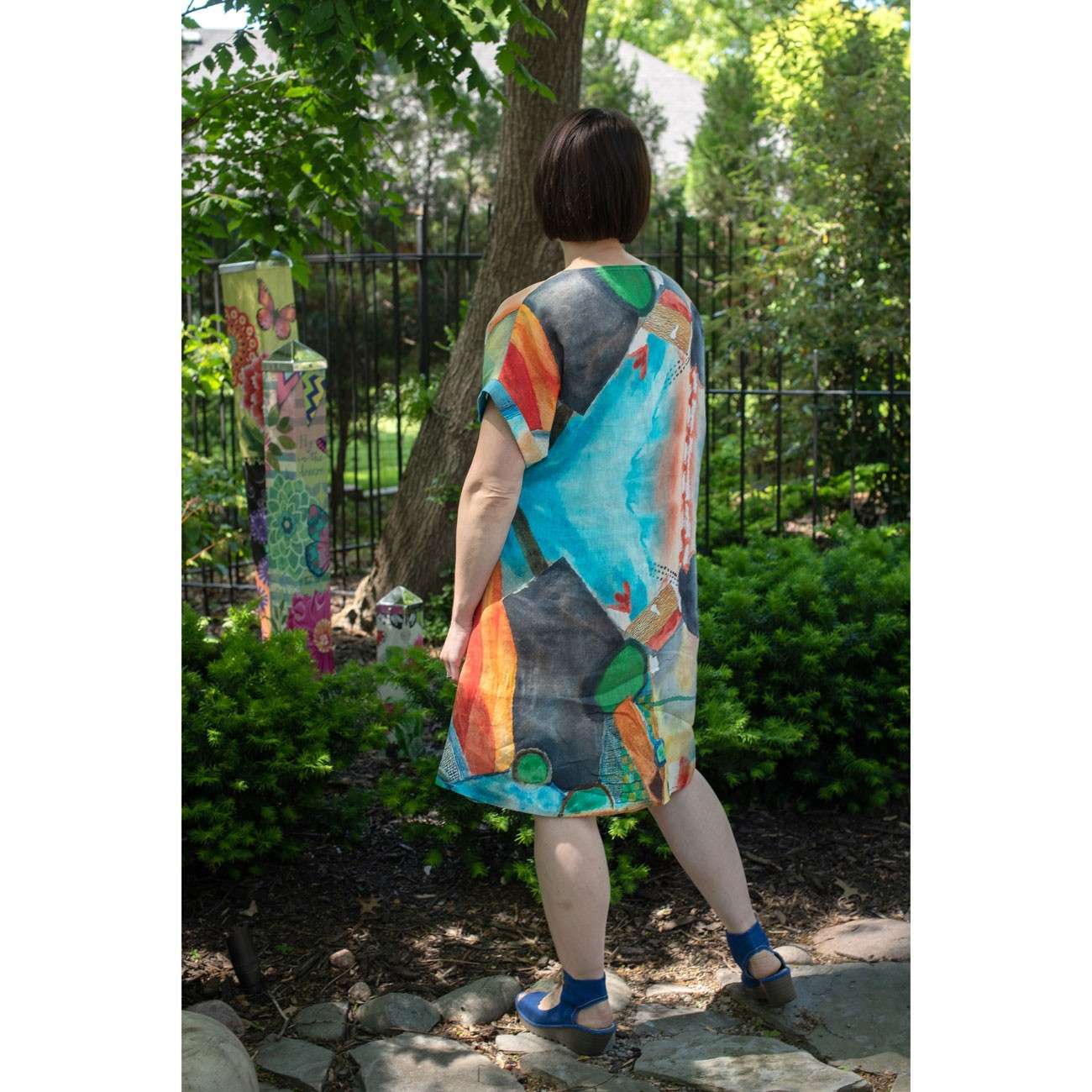 Dress: Loose-fitting, below-knee dress. Four tucks and tie accentuate waistline. Open neckline has partially sewn tuck at center front and is finished with bias binding. Extended shoulder line finished with folded armhole bands. Blouse: Loose-fitting, hip-length blouse with tuck and neckline details same as dress. Slightly extended armholes finished with bias binding. Suggested Fabrics Rayon or Wool Challis, Cotton, Linen, Silk, and Knit. Notions Thread. Optional: Double-fold Bias Tape. Ball Point Bodkin. Sizes XS - XXXL