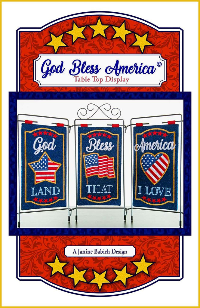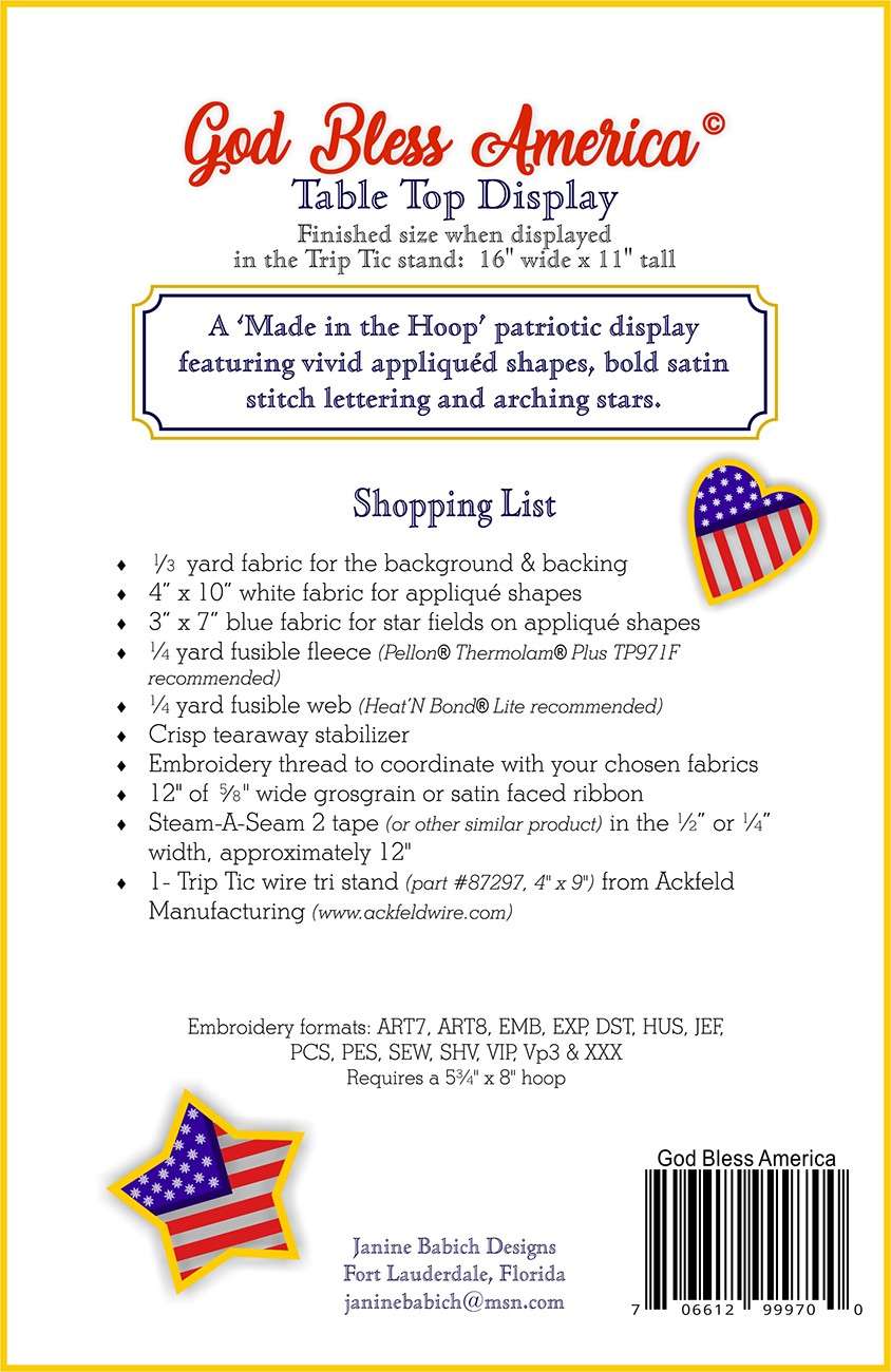 Celebrate your love of this great country of ours when you craft this 'Made in Hoop' patriotic display that features vivid applique with star and stripe detail, bold satin stitch lettering and arching stars above and below. Finished size when display: 16" x 11". Includes embroidery formats: ART7, ART8, DST, EMB, EXP, HUS, JEF, PCS, PES, SHV,, VIP, VP3 & XXX. Requires a 5 3/4" x 8" hoop.