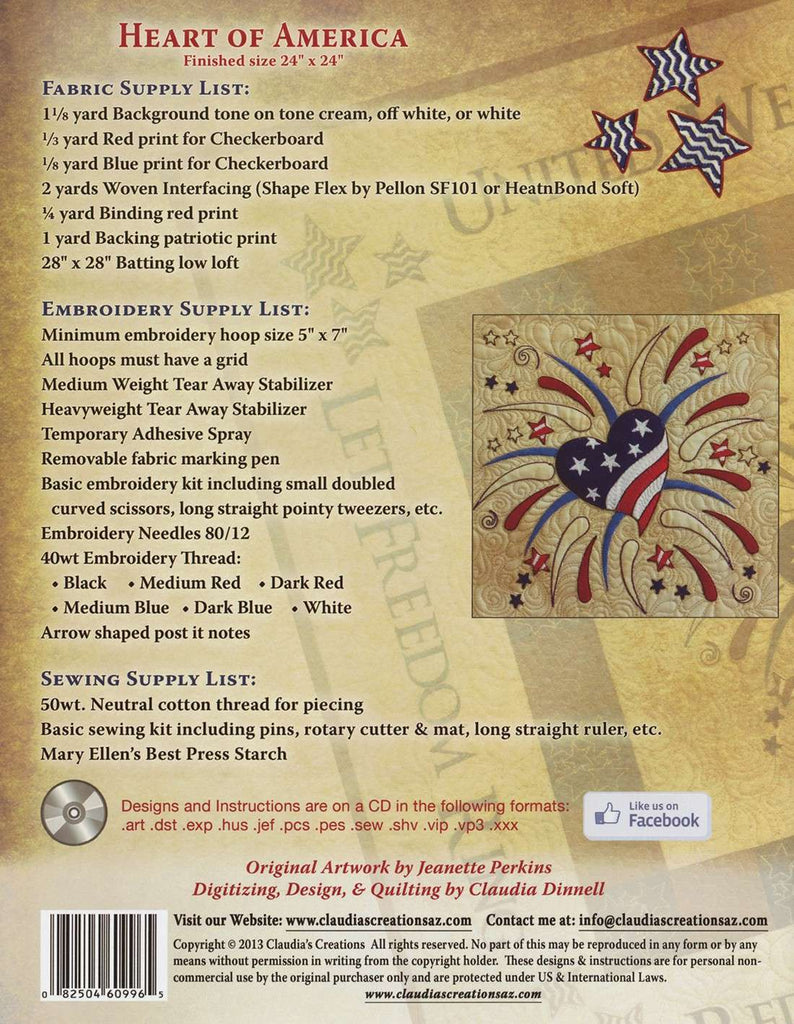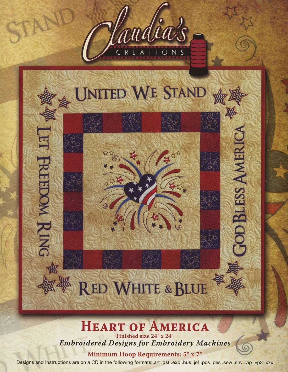 Heart of America includes instructions on a CD. Minimum hoop requirement: 5 inches x 7 inches. Formats: .art .dst .hus .jef .pcs .pes .sew .shv .vip .vp3 .xxx. Finished Quilt Size: 24 inches x 24 inches.