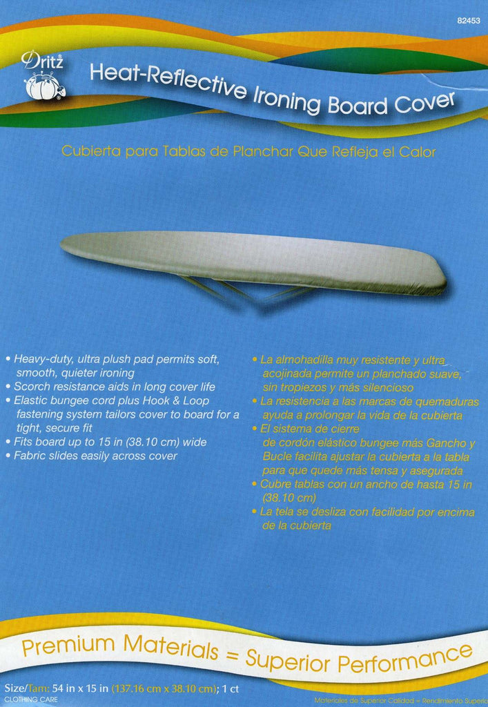 Heavy-duty - ultra plush pad permits soft -smooth -quieter ironing. Scorch resistance aids in long cover life. Elastic bungee cord plus Hook & Loop fastening system tailors cover to board for a tight - secure fit. Fits board up to 15 inch wide. Fabric slides easily across cover.