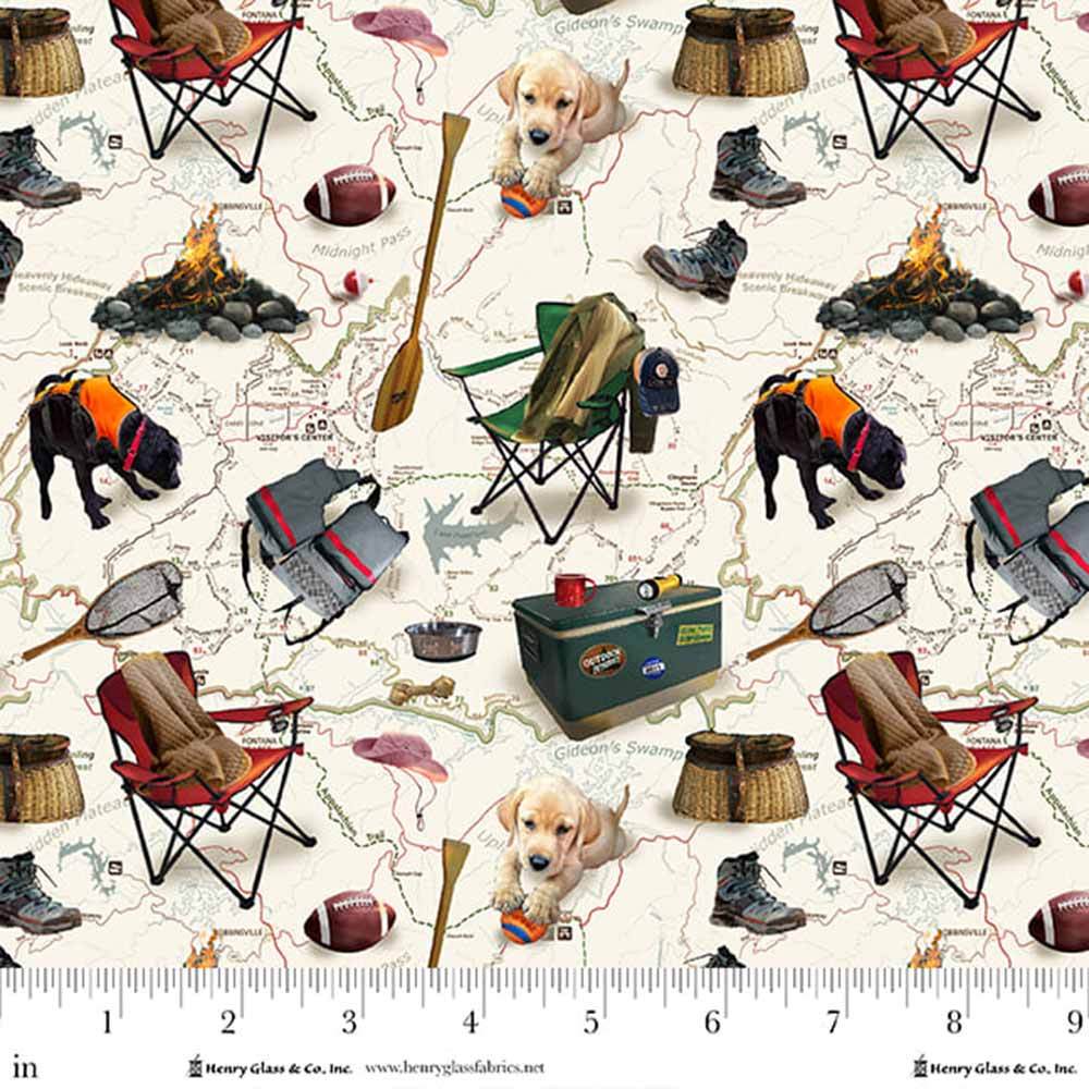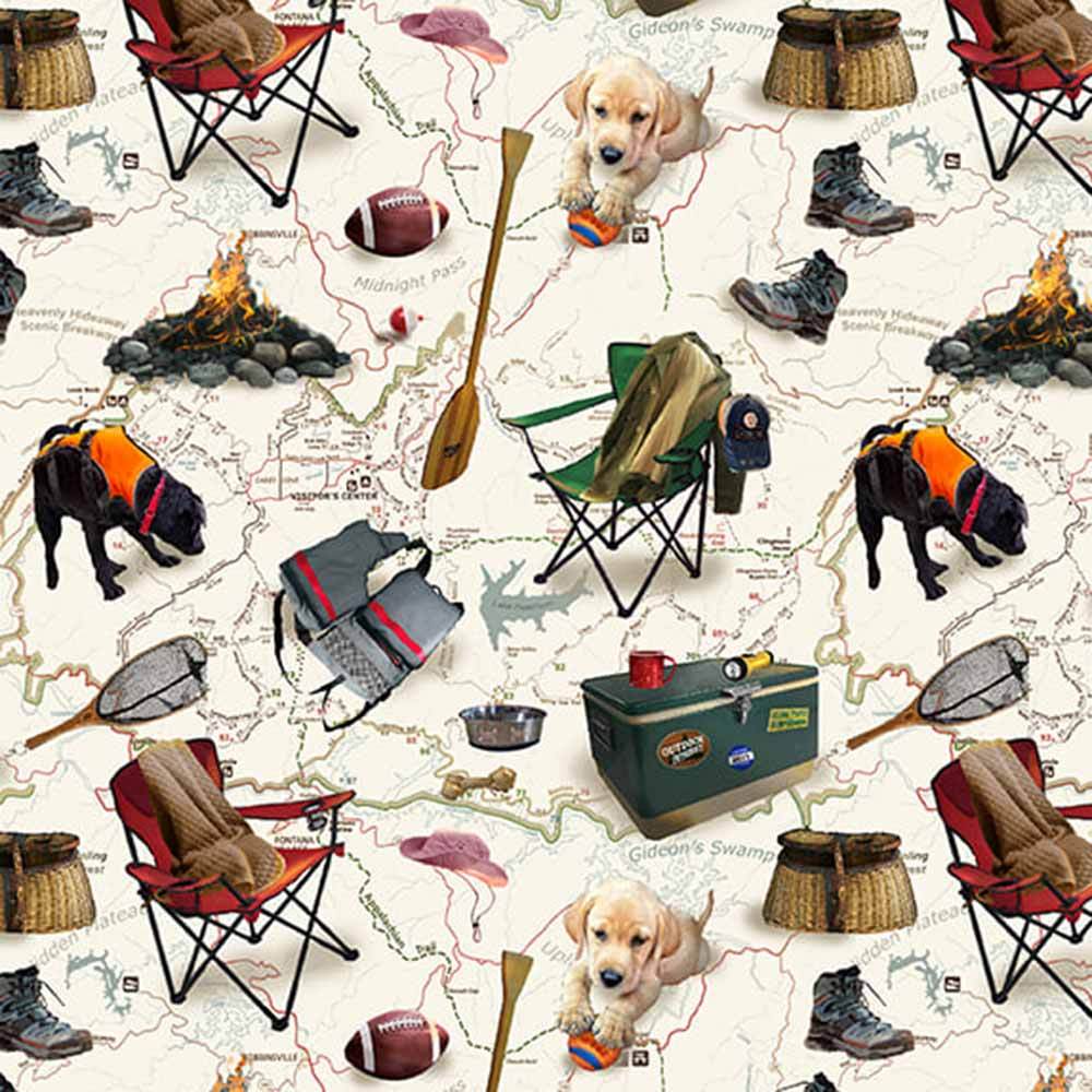 Adventure, fishing, trail maps and campfires - and don't forget the pups! The Camping Pups print in Cream is by Robert Giordano from his collection for Henry Glass.