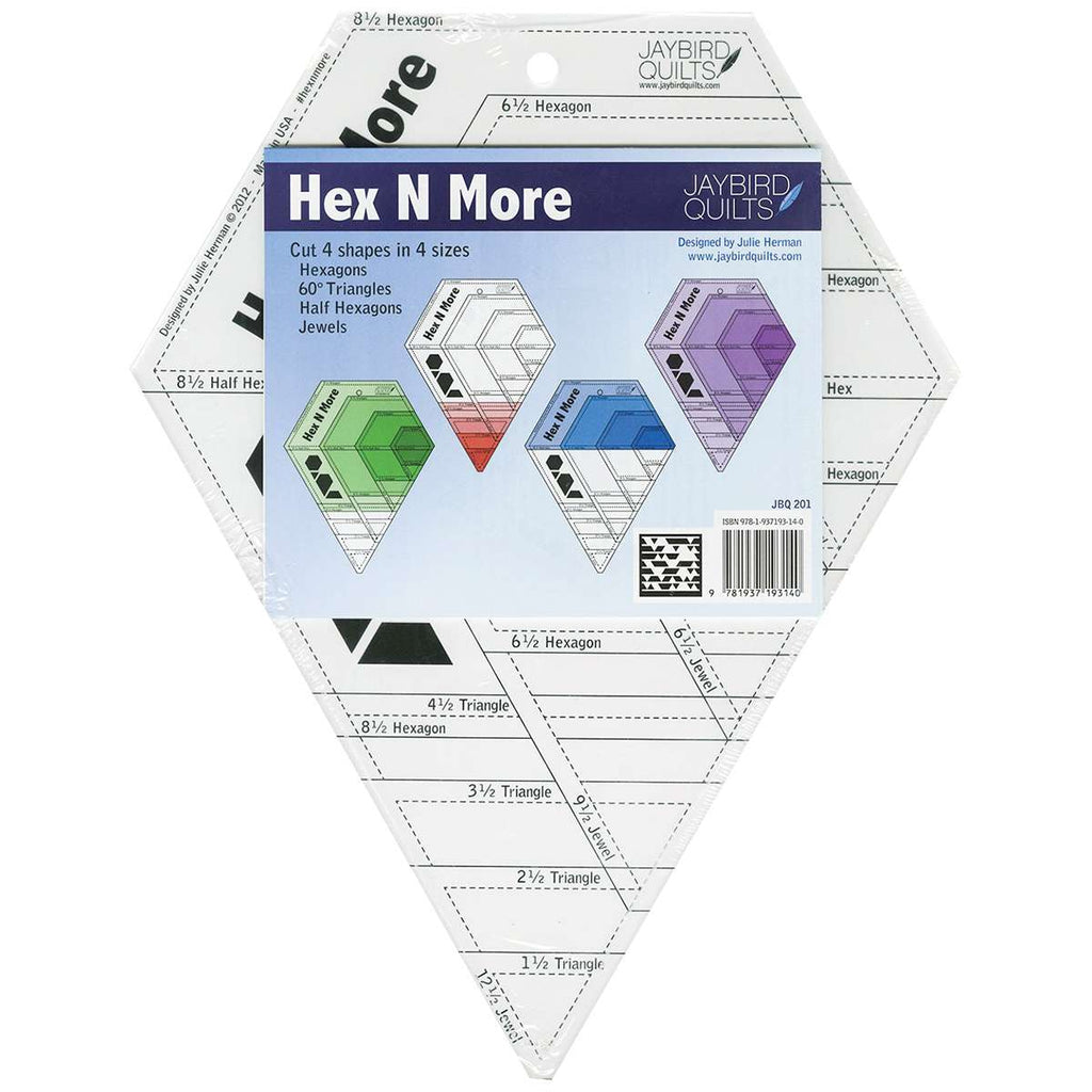 Rotary cut four shapes in four sizes with this acrylic template by Jaybird Quilts. Includes directions for cutting hexagons, 60-degree triangles, half hexagons and jewels from strips.