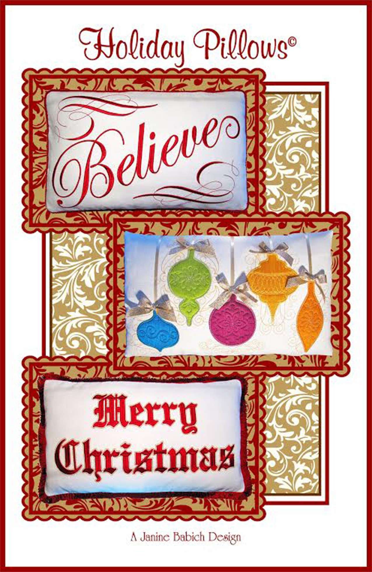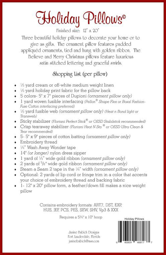 Three beautiful machine embroidered holiday pillows to decorate your home or to give as gifts. Hoop Size: 5 3/4 inches x 9 3/4 inches. Formats: ART7, DST, EXP, HUS, JEF, PCS, PES, SEW, SHV, VP3 & XXX. Finished size: 12 inches x 20 inches.