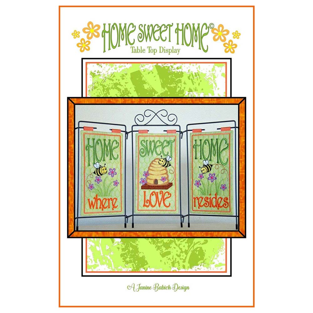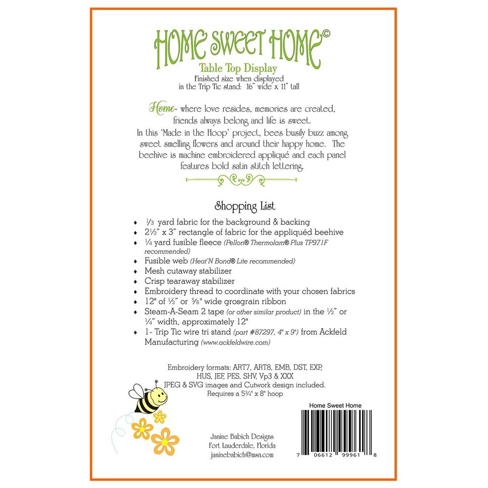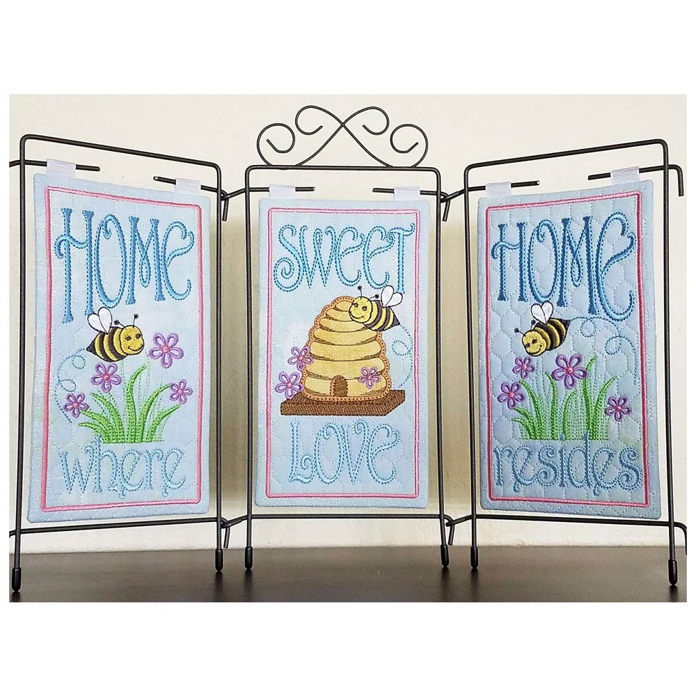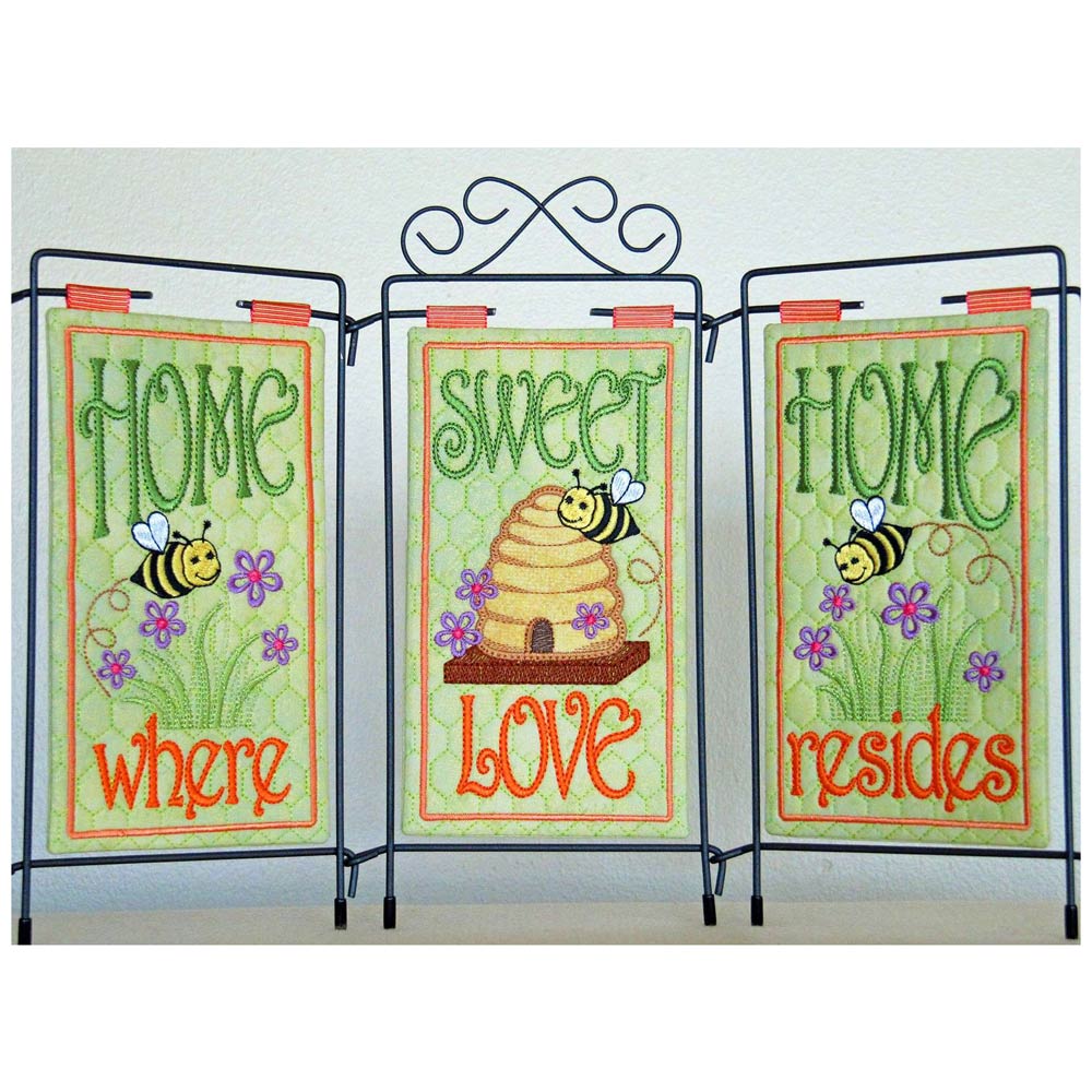 Home, where love resides, memories are created, friends always belong and life is sweet.' This 'Made in the Hoop' project features bees busily buzzing among sweet smelling flowers and around their happy home. The beehive is created with machine embroidered applique and each panel features bold, satin stitch lettering. Finished size: 16" x 11" when displayed in the Trip Tic stand. Includes embroidery formats: ART7, ART8, DST, EMB, EXP, HUS, JEF, PES, SHV, VP3 & XXX. SVG and JPEG images are included for use with digital cutting machines along with Cutwork designs. This pattern requires a 5 3/4" x 8" hoop.