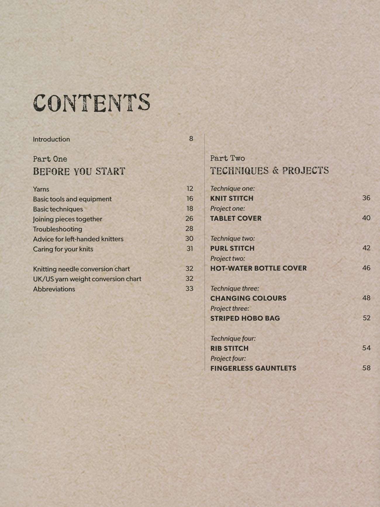 How to Knit is the ultimate knitting guide for the absolute beginner. For those with little or no knitting experience, this simple-to-learn, project-based book will start with the basics and take you through the initial stages of this fun and creative craft. Each technique is clearly explained and accompanied by a stylish project to make, so that you can put your newly acquired knowledge into practice. Demonstrate your new skills to friends and family with designs that include a hobo bag, beanie hat or clutch bag. Beginners will learn all the essentials, from how to hold needles, cast on and off, make a tension swatch and form the basic knit and purl stitches, to how to knit stripes, cable, rib and lace, plus shape their knitting and add buttonholes. Clear step-by-step illustrations and beautifully shot photographs of the finished projects are included throughout, making it both practical and inspirational--the ideal book for want-to-be knitters!
