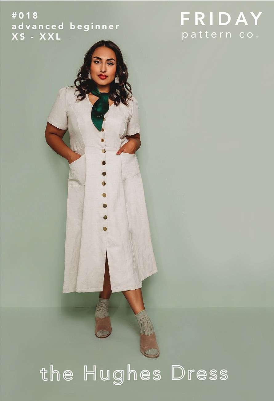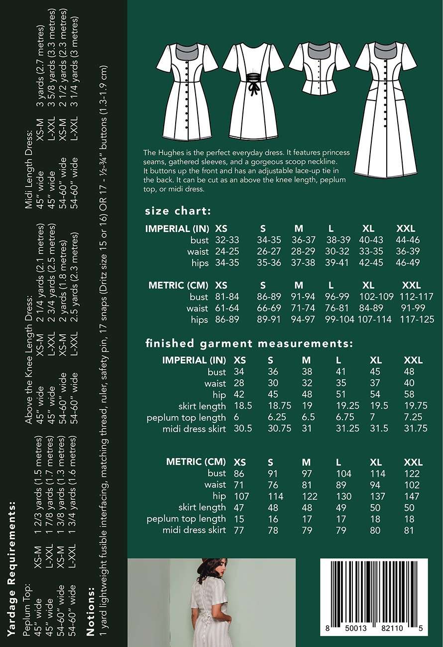 The Hughes Dress is the perfect everyday dress. It features princess seams, sleeves that gather at the cap, and a gorgeous scoop neckline. It buttons (or snaps) up the front and has an adjustable lace-up tie in the back. This pattern comes with options to cut it as a peplum top, above-the-knee length dress, or midi dress. The Hughes Dress is designed to be beautiful and flattering with design elements that make it comfortable and easy to wear.
