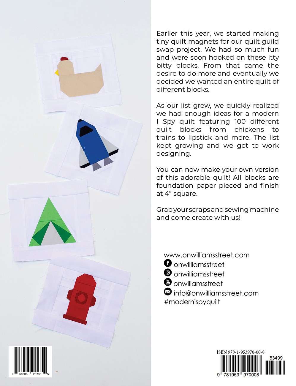 I Spy is our own modern take on an I Spy quilt. We have included ideas from 10 different categories to provide a fun and varied quilt that appeals to all! Whether you are using the blocks all together in one quilt, or mixing and matching for all sorts of project opportunities, we are sure you’ll find something for the loved ones on your quilting list! Book contains: - Instructions for 100 - 4"" Foundation Paper Pieced Quilt Blocks - Instructions for putting all 100 blocks together to make a 51" square quilt with suggestions for additional sizes - Quilting suggestions for the finished top - Link to download all of the templates needed for each quilt block (actual templates are not included in the book) - List of tools needed to complete the quilt - Instructions on how to Foundation Paper Piece