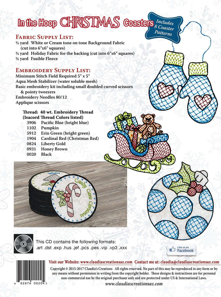 In The Hoop Christmas Coasters are completely embroidered and finished in the hoop. Stitch field Required: 5 inches x 5 inches. Finished Size: 4 1/2 inches. Instructions for embroidery and piecing need to be printed from the CD. Formats: ART, DST, EXP, HUS, JEF, PCS, PES, VIP, VP3, XXX.
