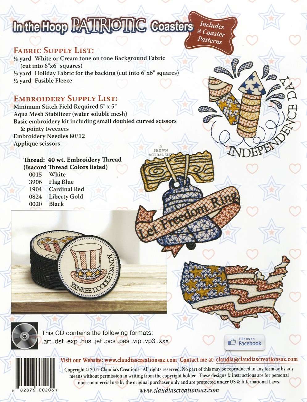 In The Hoop Patriotic Coasters are completely embroidered and finished in the hoop. Stitch field Required: 5 inches x 5 inches. Finished Size: 4 1/2 inches. Instructions for embroidery and piecing need to be printed from the CD. Formats: ART, DST, EXP, HUS, JEF, PCS, PES, VIP, VP3, XXX.