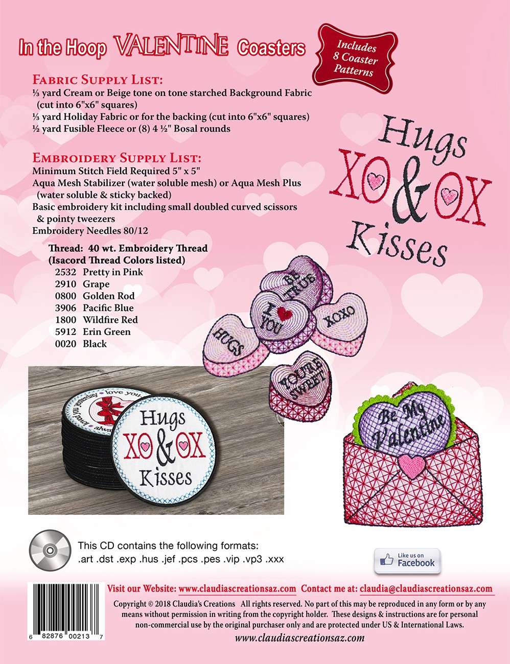 In The Hoop Valentine Themed Coasters are completely embroidered and finished in the hoop. Stitch field Required: 5 inches x 5 inches. Finished Size: 4 1/2 inches. Instructions for embroidery and piecing need to be printed from the CD. Formats: ART, DST, EXP, HUS, JEF, PCS, PES, VIP, VP3, XXX.