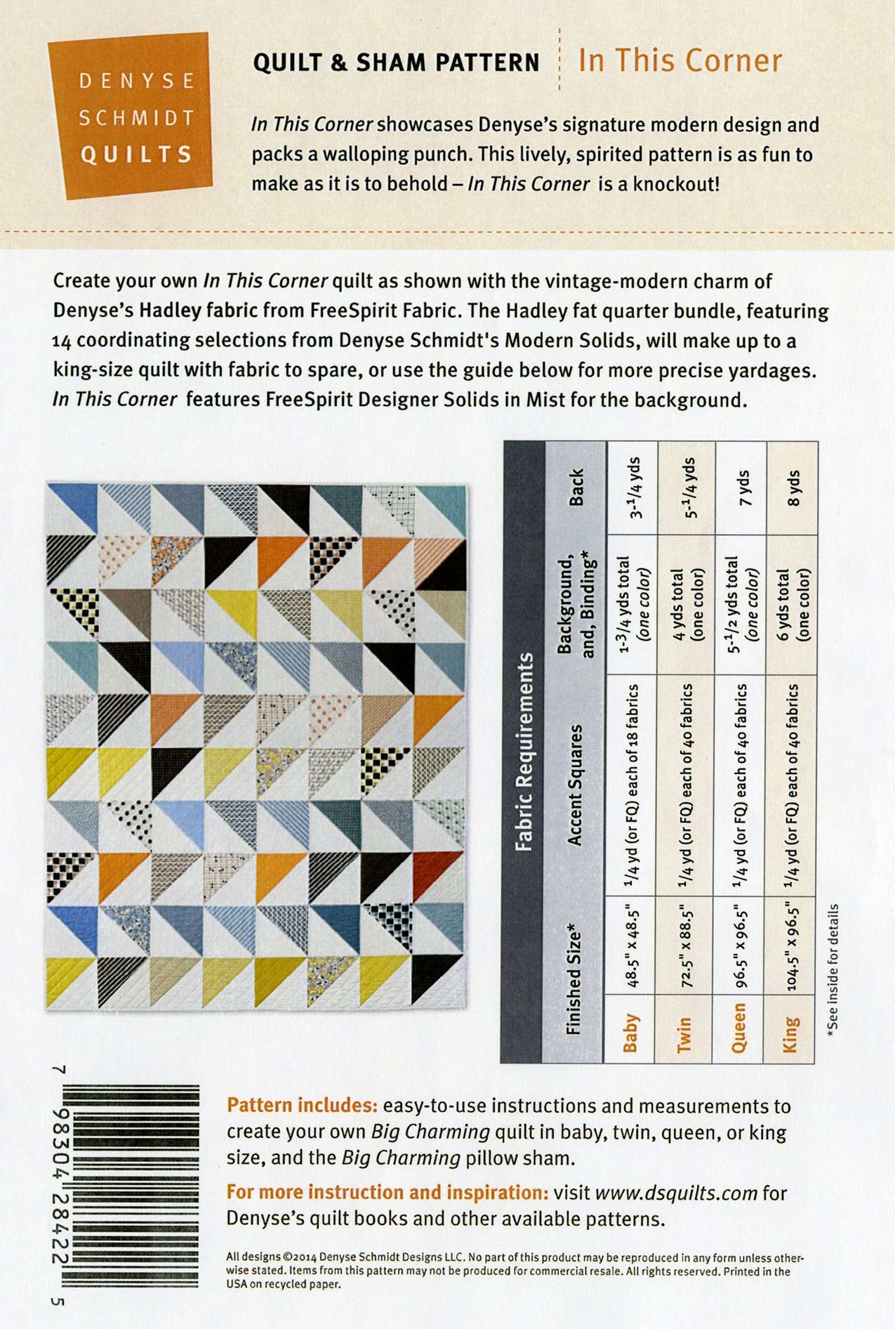 In This Corner is bold and graphic in Denyse's style. A fat-quarter bundle with 26 prints and 10 solids will make up to a king size quilt. Instructions and measurements are included to make any size quilt from crib to king. Finished Sizes: 48 1/2 inches x 48 1/2 inches, 72 1/2 inches x 88 1/2 inches, 96 1/2 inches x 96 1/2 inches, and 104 1/2 inches x 96 1/2 inches. Fabric not included.