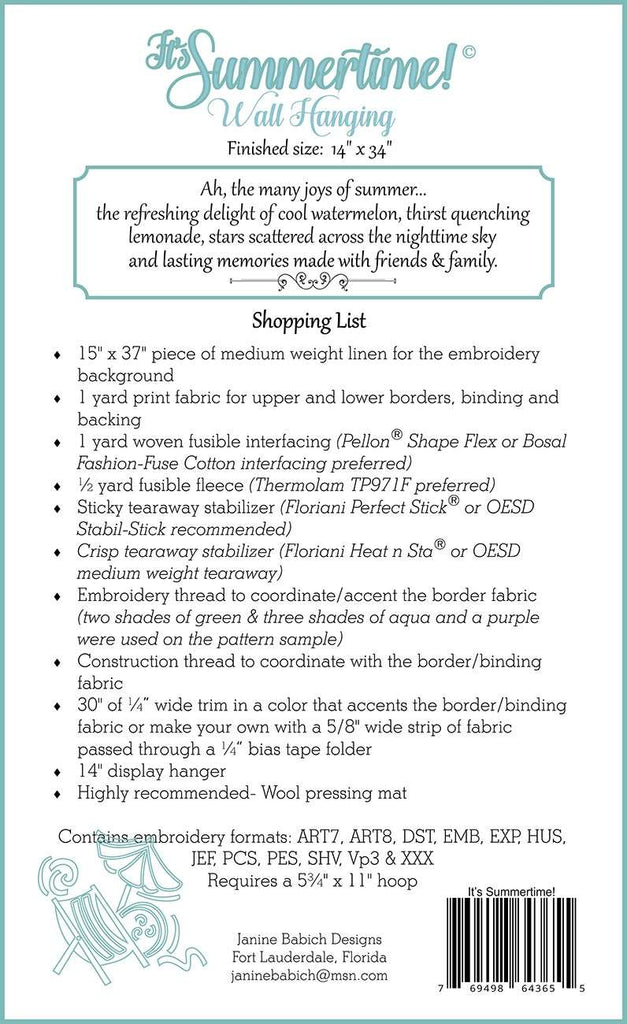 Celebrate these and many more summertime joys when you craft this fun wall hanging. Hoop Size: 5 3/4 inches x 11 inches. Formats: ART7, ART8, DST, EMB, EXP, HUS, JEF, PCS, PES, SHV, VP3 & XXX. Finished size: 14 inches x 34 inches.