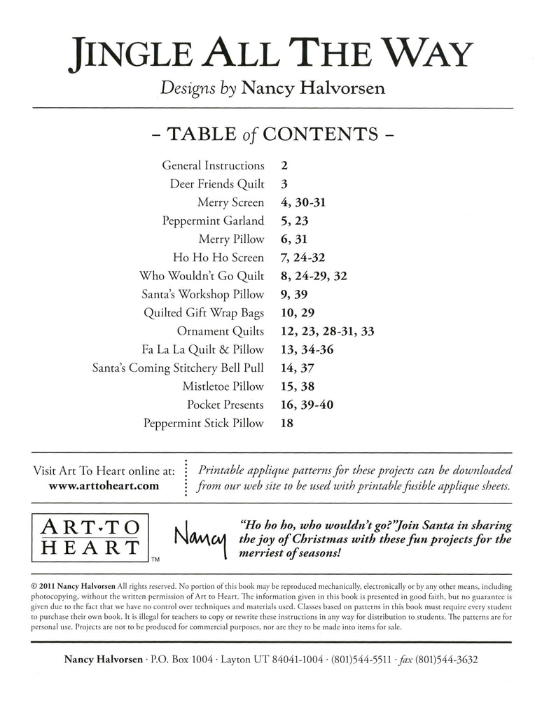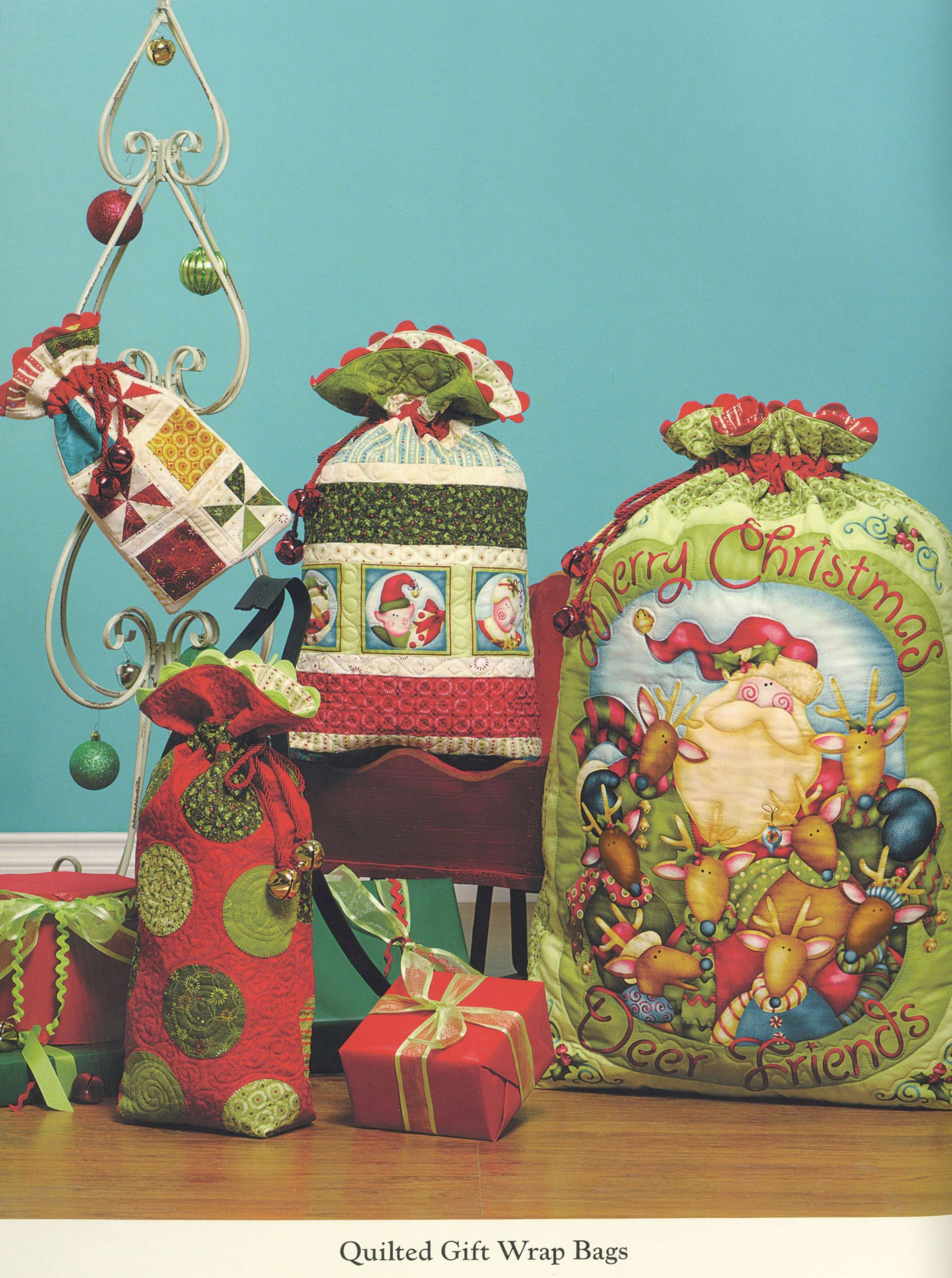 Ho, ho ho, who wouldn't go? Join Santa in sharing the joy of Christmas with these fun projects for the merriest of seasons! Christmas theme projects include: wall quilts and ornaments, decorative screens, garland, pillows, gift wrap bags, tag pockets, panel quilt 42" x 50", bell pull.