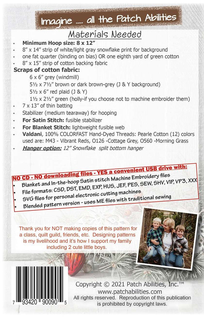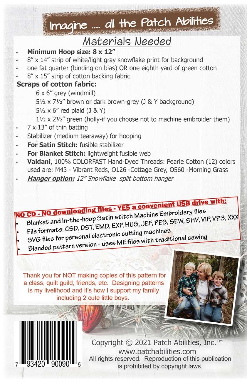 The same top quality, easy-to-complete fusible applique patterns you love us for are now available in machine embroidery blended pattern versions. You get to traditionally piece the background before putting into your hoop to machine embroidery the applique design blanket stitch or in-the-hoop satin stitch. Our patterns with a -ME suffix include a convenient USB stick with Machine Embroidery files: CSD, DST, EMD, EXP, HUS, JEF, PES, SEW, SHV, VIP, VP3, and XXX. SVG cutting files included. Joy with a farm windmill for the O and a few tiny holly give it a farmhouse Christmas holiday feel. Includes step-by-step instructions with helpful tips, techniques, and easy-to-use tracings will be appreciated by users of all skill levels. Included USB stick ensures that you won't have to waste time downloading files. Makes a perfect class project, teach to beginners learning how to machine embroidery, use fusible web, and even bind with complete binding instructions included. Skill Level: Beginner/Easy with Machine Embroidery Finished Size: 6 x 12 in