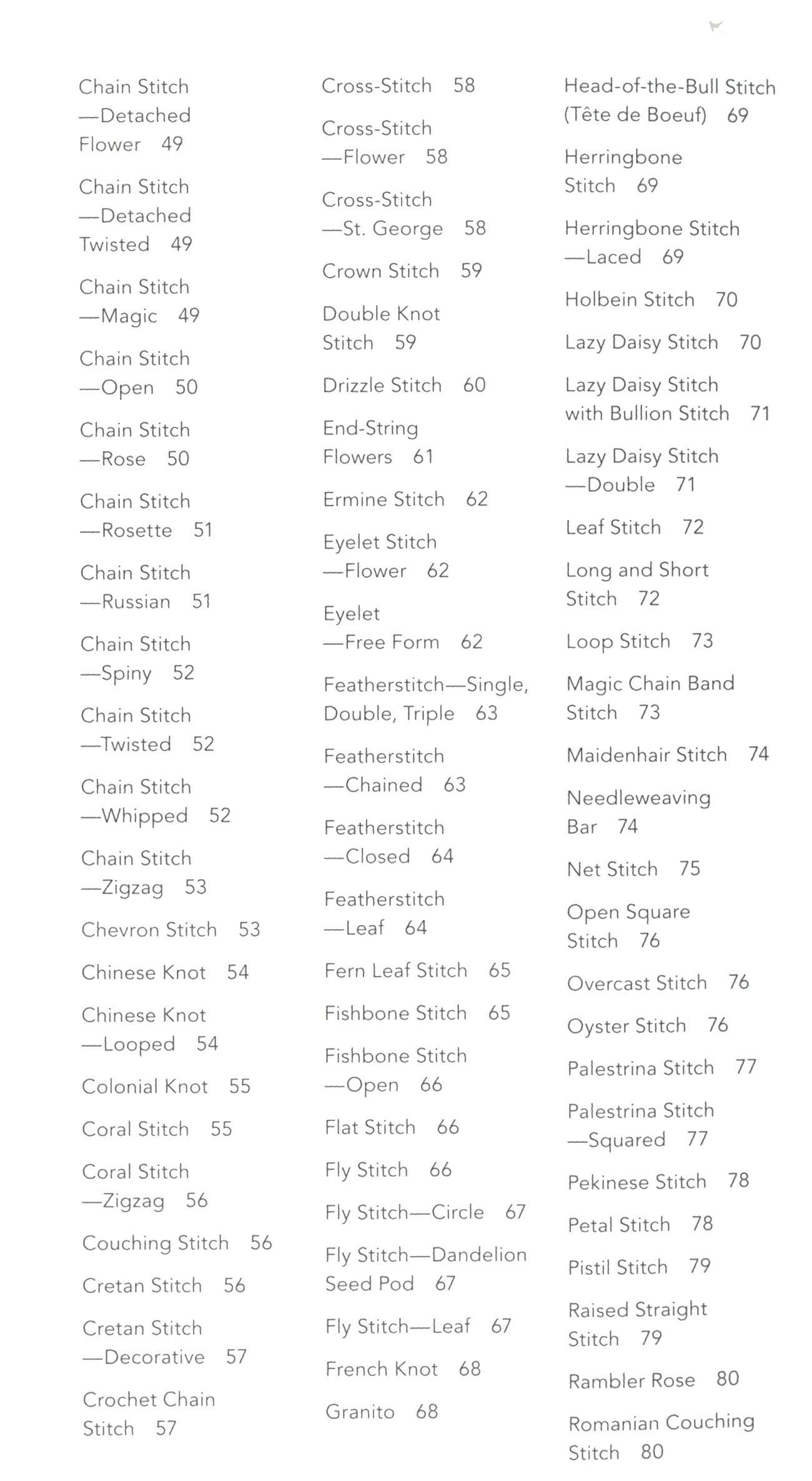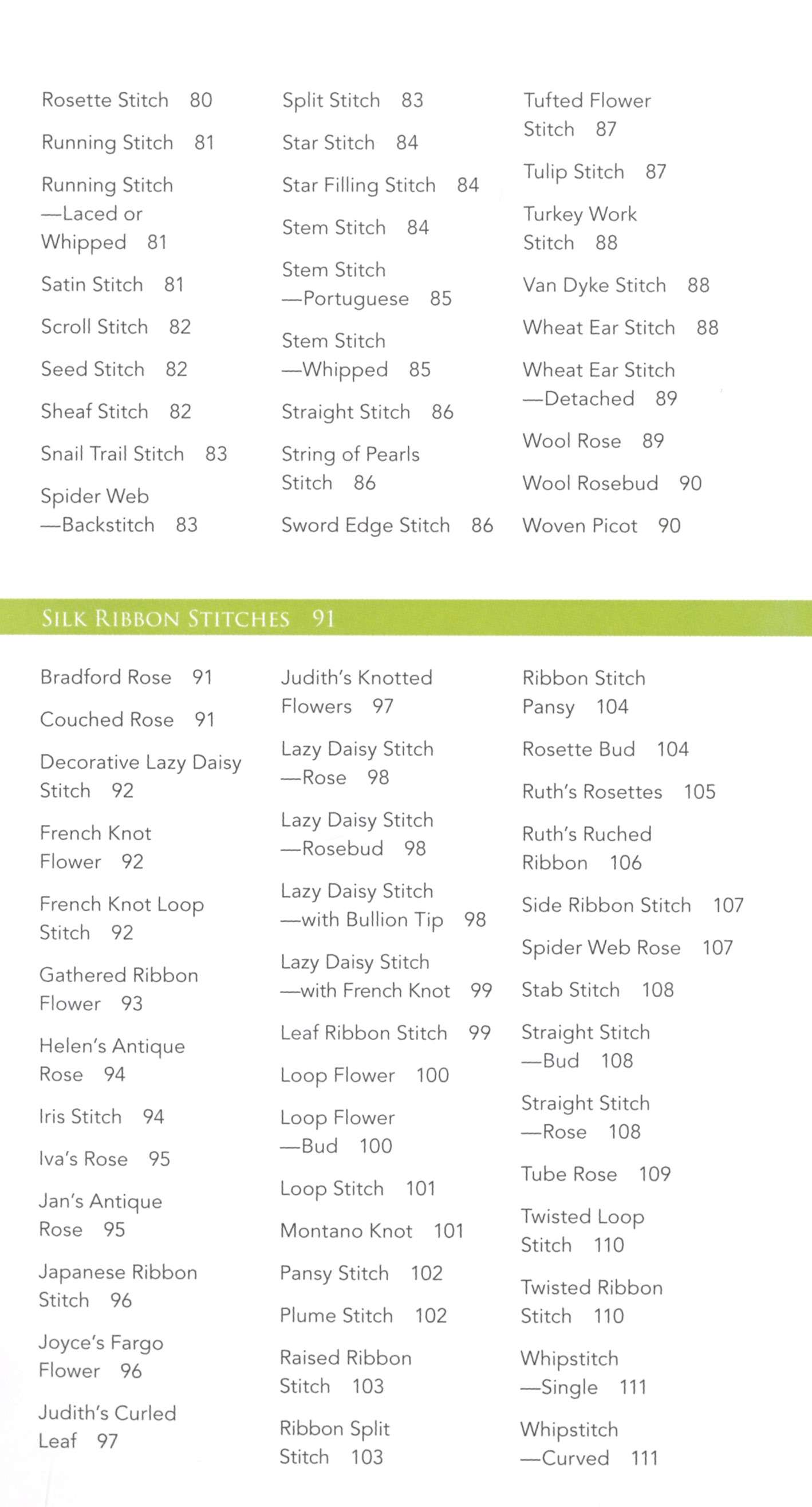 • Full-color illustrations of 180+ stitches including embroidery, silk ribbon stitches, crazy quilt combinations, and advice for left-handed stitchers.