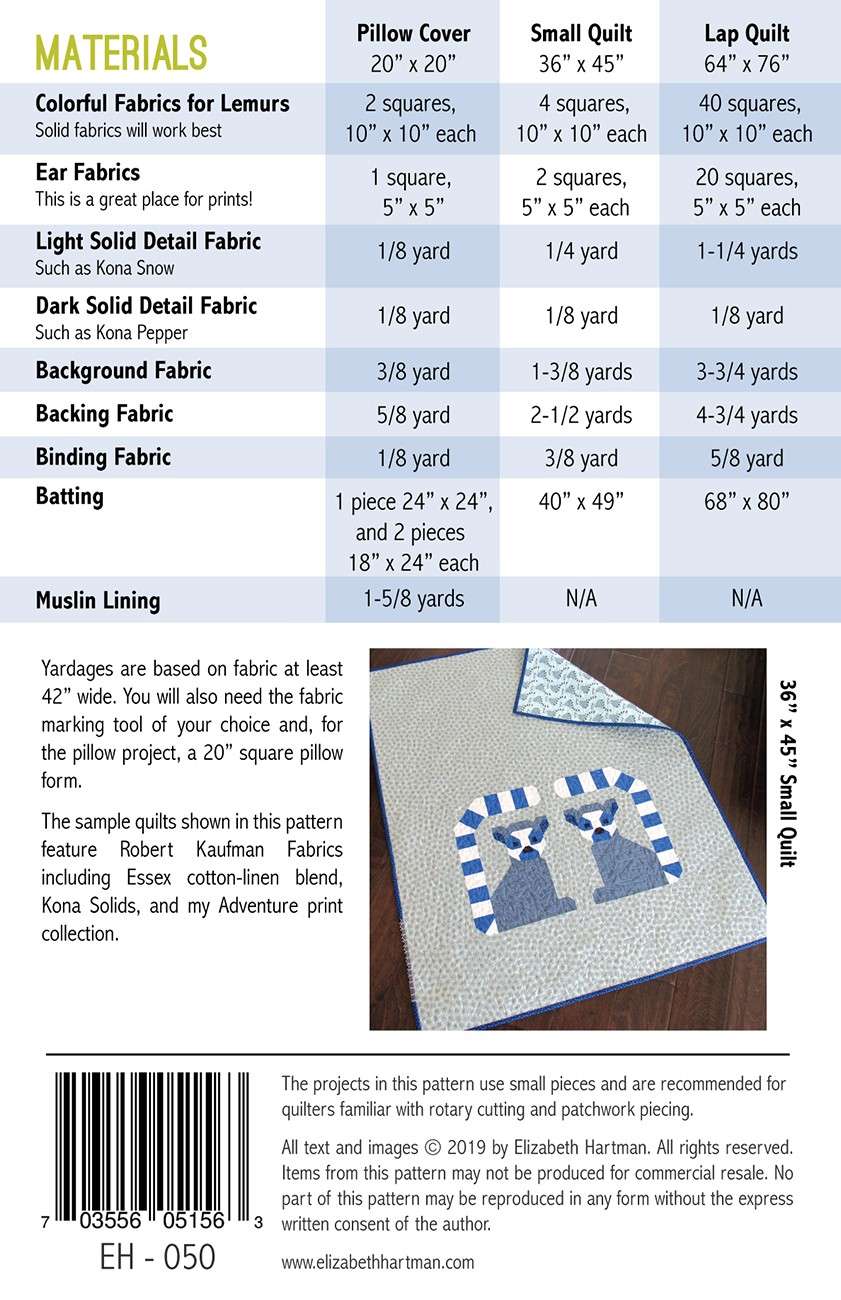 Piece these adorable lemurs and their stripey tails using pre-cut fabric squares. All piecing is done using conventional patchwork techniques. No templates or paper piecing! Pattern uses 5” and 10” pre-cut squares and includes instructions for making a 20” x 20” pillow cover, a 36” x 45” small quilt, and a 64” x 76” large quilt.