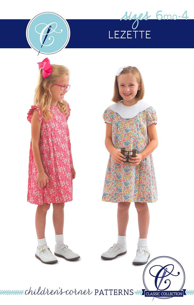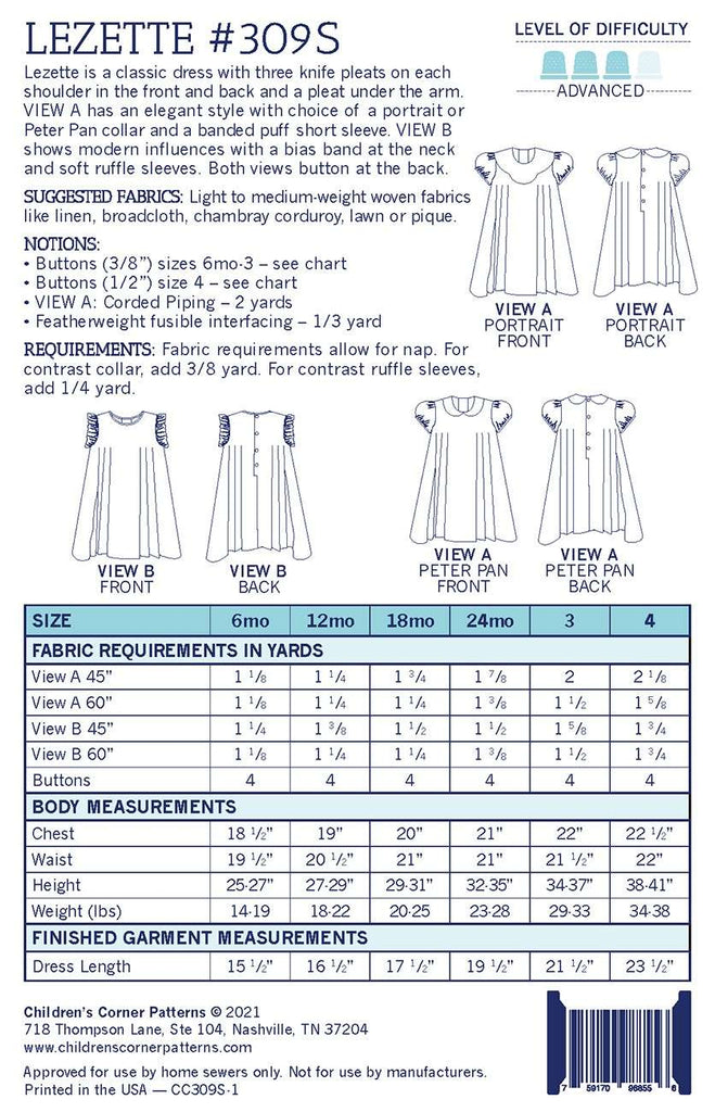 Lezette is a classic dress with three knife pleats on each shoulder in the front and back and a pleat under the arm. VIEW A has an elegant style with a choice of portrait or Peter Pan collar and a banded puff short sleeve. VIEW B shows modern influences with a bias band at the neck and soft ruffle sleeves. Both views button at the back. Available in Sizes 6 months-4 and Sizes 5-8.