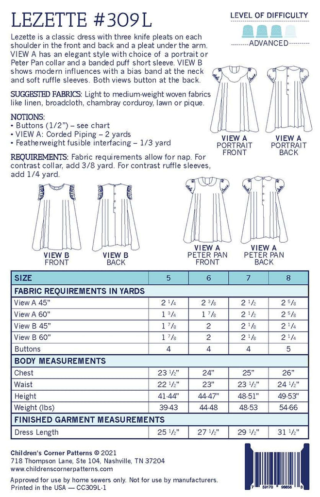 Lezette is a classic dress with three knife pleats on each shoulder in the front and back and a pleat under the arm. VIEW A has an elegant style with a choice of portrait or Peter Pan collar and a banded puff short sleeve. VIEW B shows modern influences with a bias band at the neck and soft ruffle sleeves. Both views button at the back. Available in sizes 6 months - 4 and sizes 5-8.