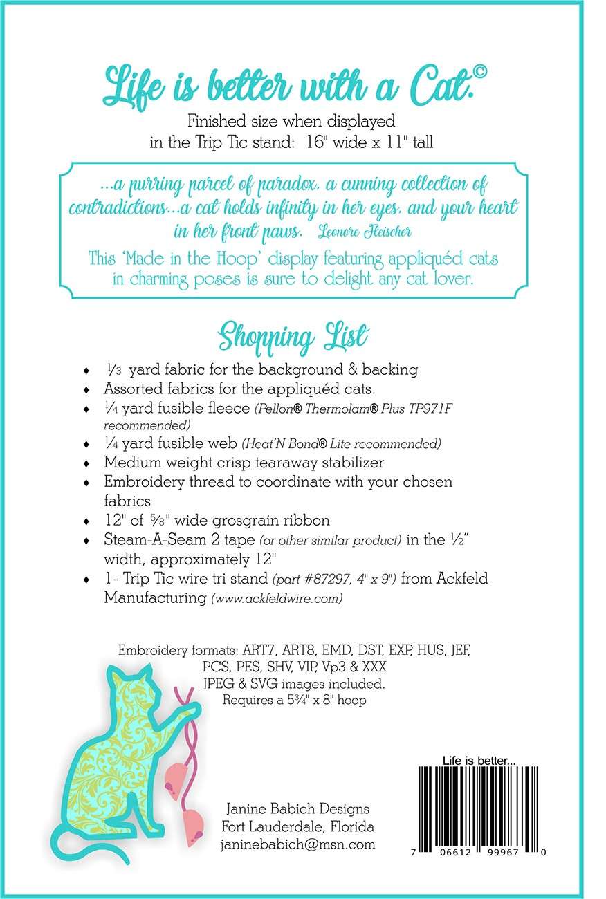 An Italian proverb states 'Happy is the home with at least one cat.' and many a cat lover would agree. This fun 'Made in the Hoop' display that features appliqued cats in charming poses is sure to delight any cat lover. Finished size: 16" x 11" when displayed in the trip tic stand. Includes formats: ART7, ART8, EMB, DST, EXP, HUS, JEF, PCS PES, SEW, SHV, VIP, VP3 & XXX. JPEG & SVG images included. Requires a 5 3/4" x 8" hoop.