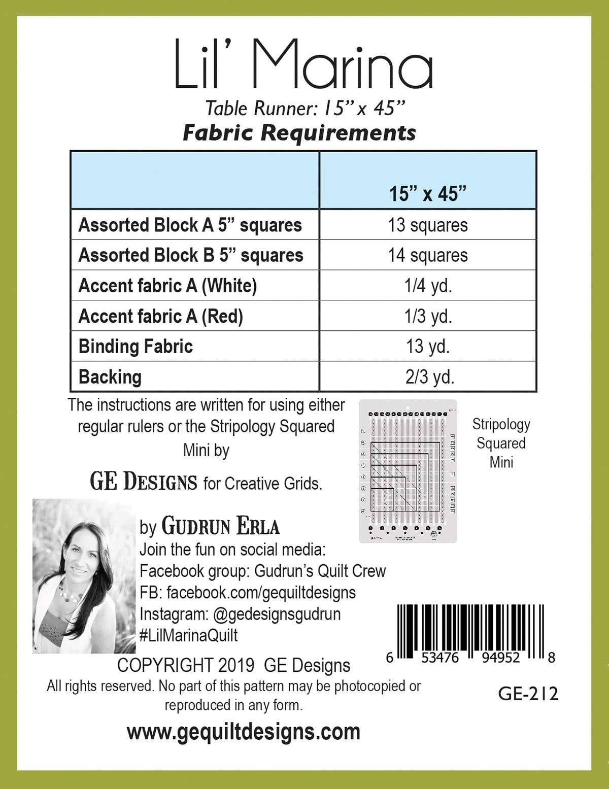 Table runner made from 5 inch squares. Instructions are written for using either regular rulers or Stripology Squared Mini (Part #CGRGE3). Finished Size: 15 inches x 45 inches. Fabric not included.