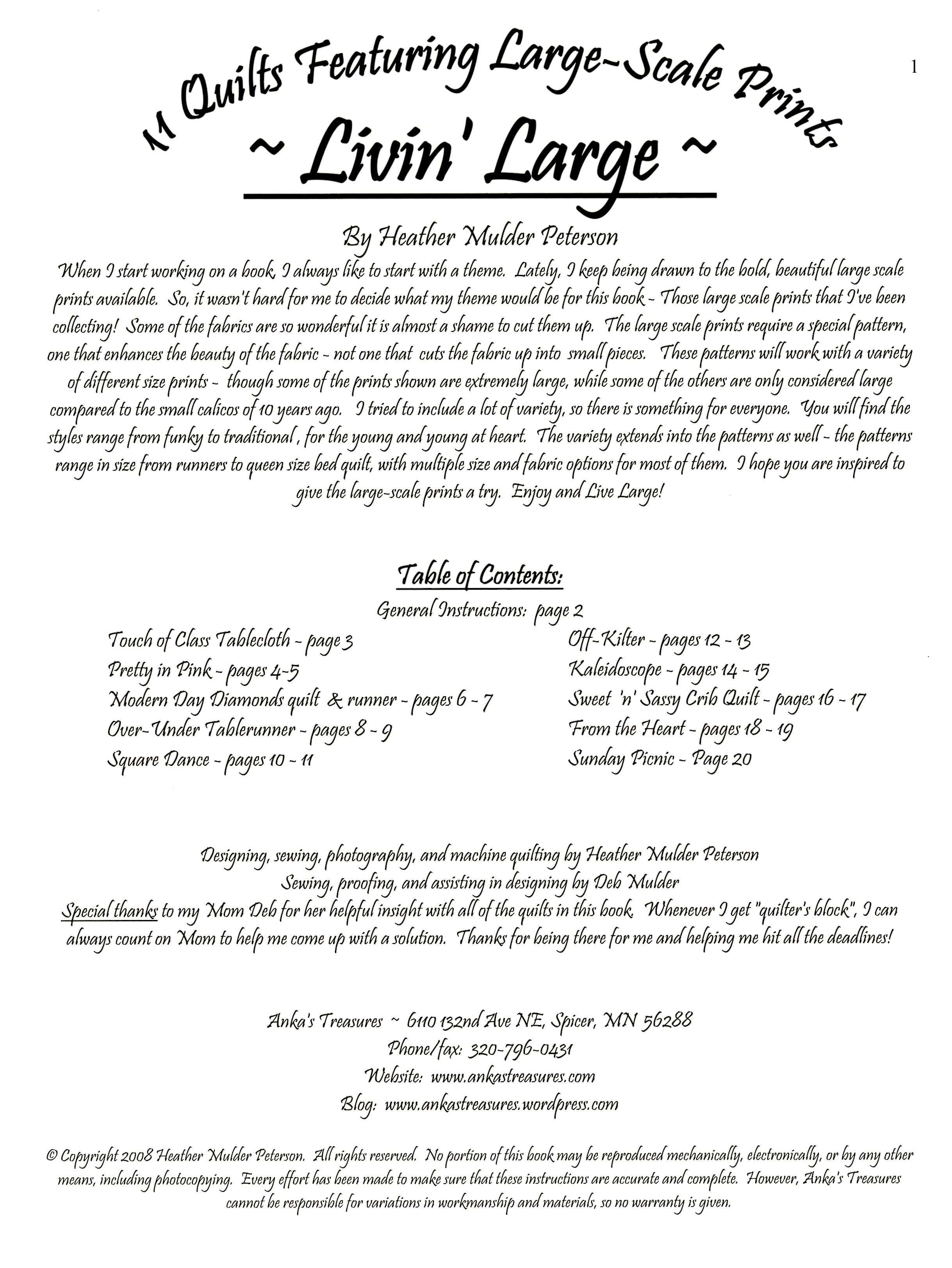 11 Quilts designed for large-scale fabrics. Over 20 size options included in the book, from table runners, to baby quilts, to lap quilts, to queen size quilts.