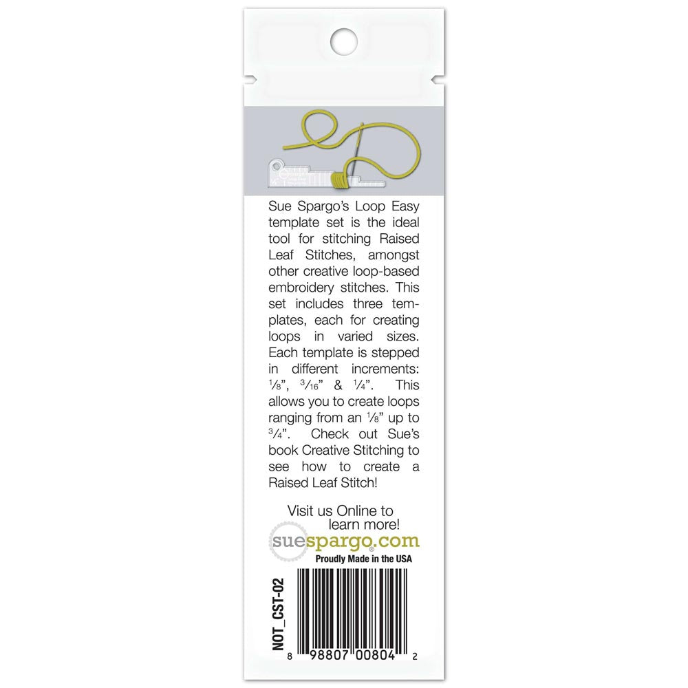 The Loop Easy is our most innovative Creative Stitching tool, designed to make perfect loops each and every time! Each set contains three templates. Each template is composed of steps that differ in height (increments: 1/8", 3/16", and 1/4in). Steps differ in length to accommodate various weights of thread. White 1/8in guides assist in marking and stitch placement. Perfect for the raised leaf stitch (instructions can be found in Creative Stitching Second Edition pg 175), grass, and blossoms, or any stitch that requires loops! Loop Easy can also be used as a measuring tool for fine details, as the guides are 1/8in apart. Directions: 1. First, remove the protective paper adhesive from each template. 2. Place Loop Easy on your project where you'd like the loops to be (for the Raised Leaf Stitch, use the edge of the Loop Easy to mark your stem length with a chalk pencil) 3. Decide the length of your loops and choose the appropriate template and step for your desired loop size 4. Bring your needle to the front of your work next to one of the white guidelines, then bring your needle to the back of your work next to the same guideline, on the other side of the template. 5. Continue this process for as many loops as you would like, using the white guidelines for even spacing 6. When you have the number of loops needed, pull your Loop Easy template out of the loops and complete your stitch as desired.