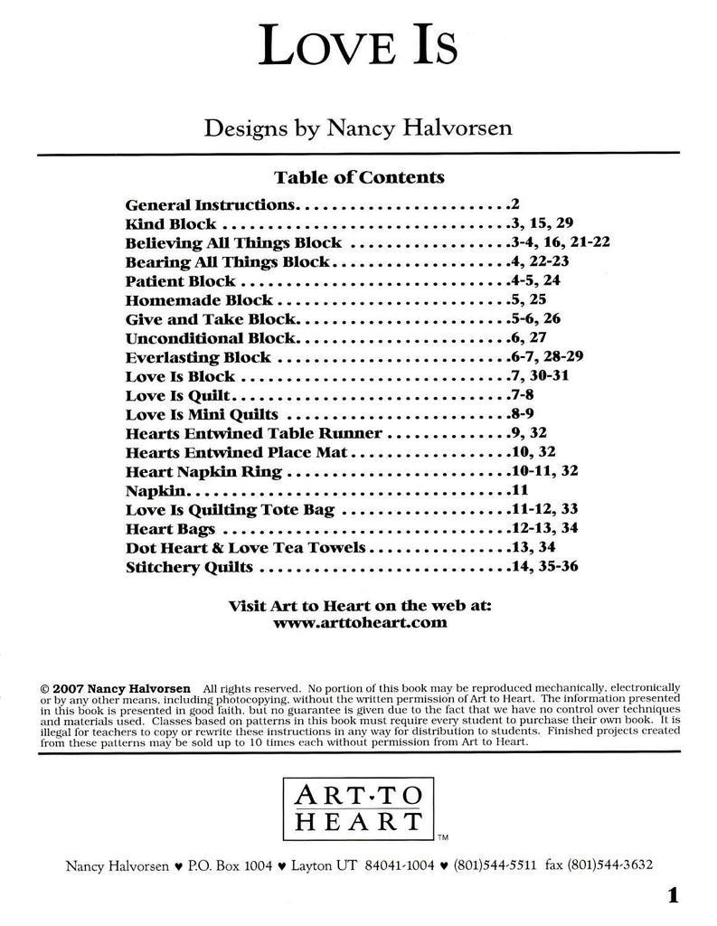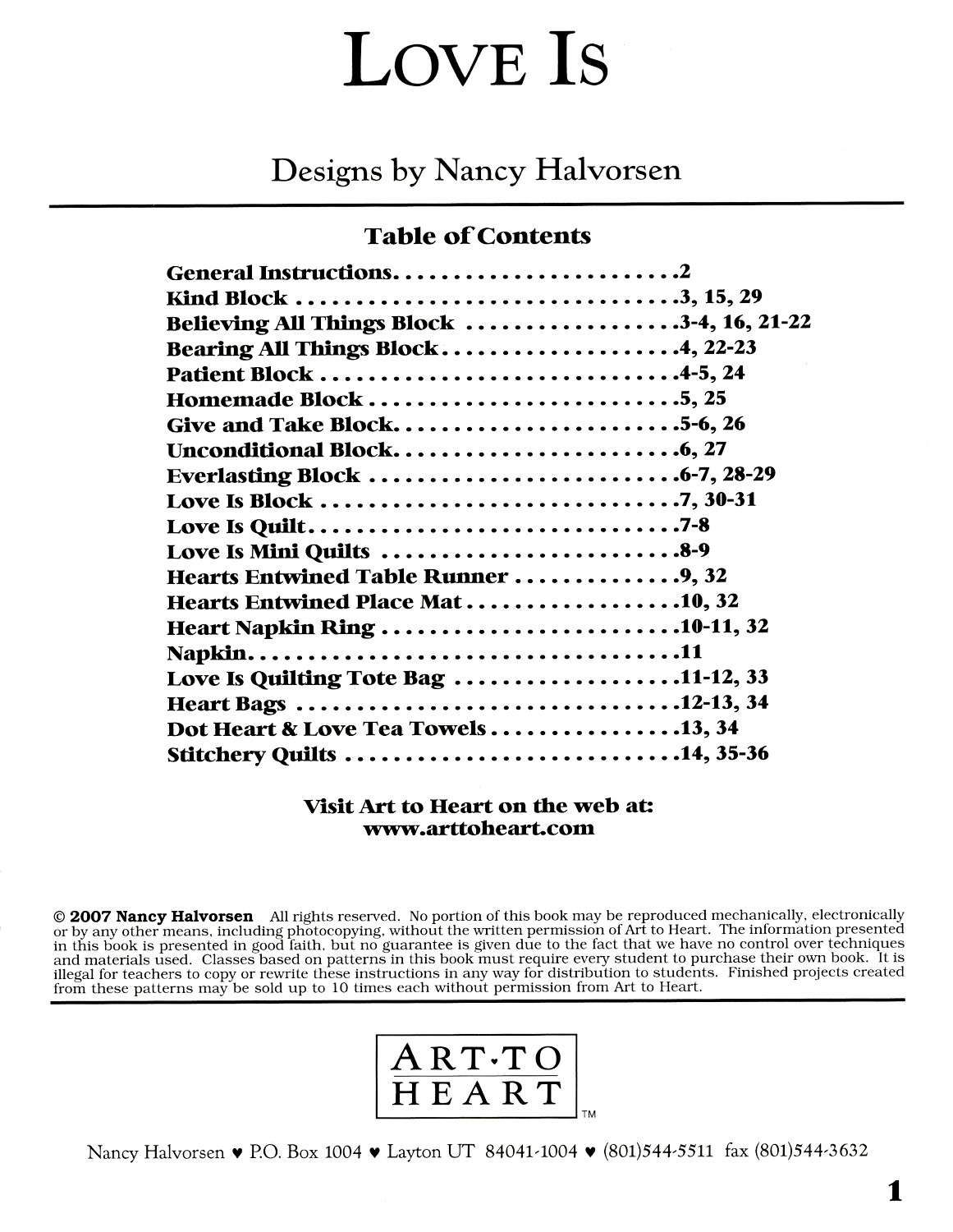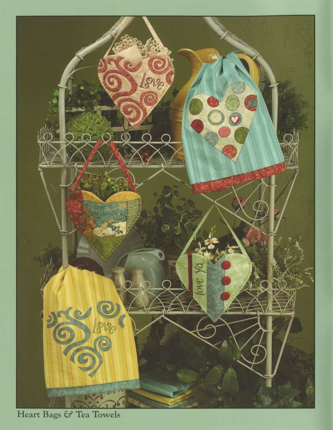 What does love mean to you? You will find new ways of expressing your love with the block-of-the-month fusible applique quilt, quilting bag, placemats, table runner, heart bags and stitcheries.