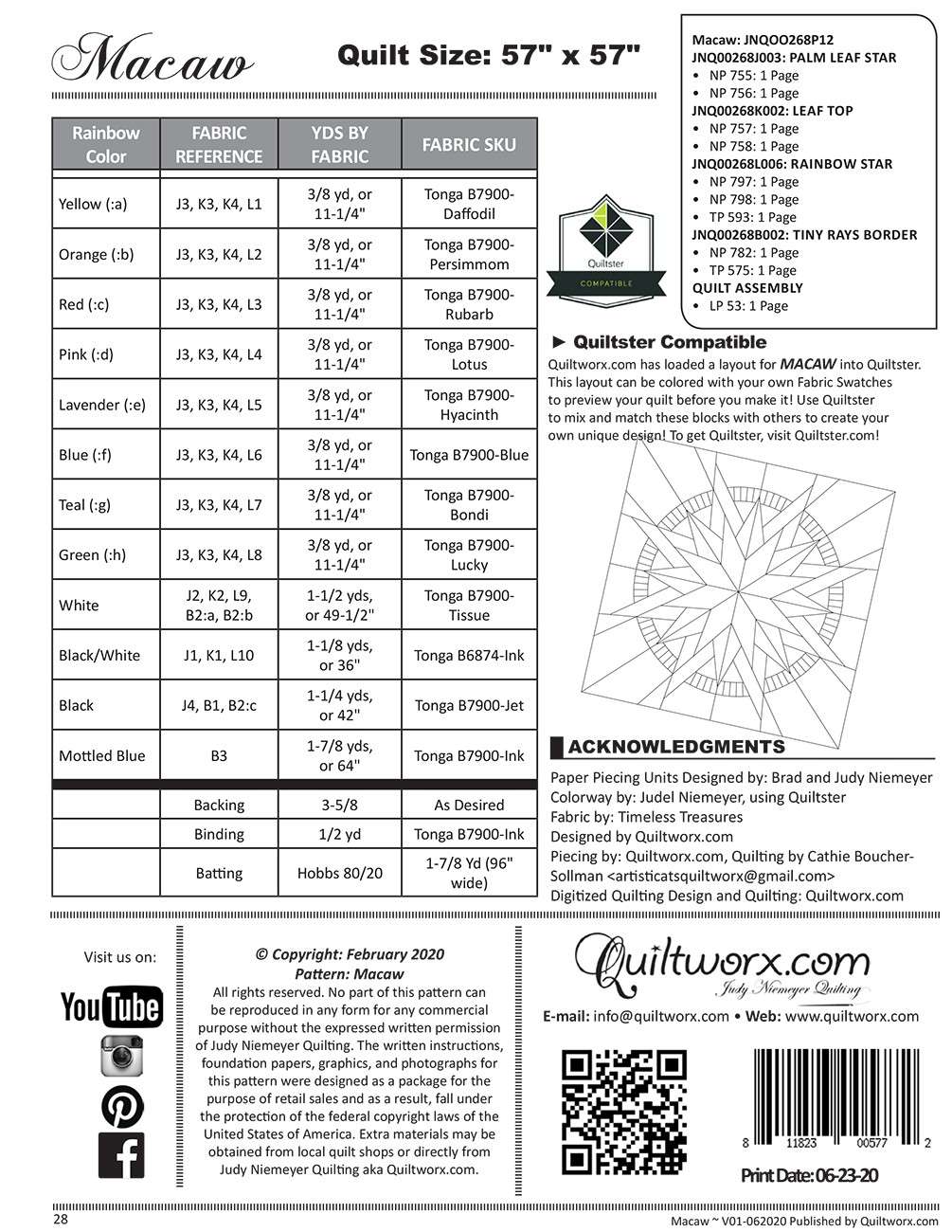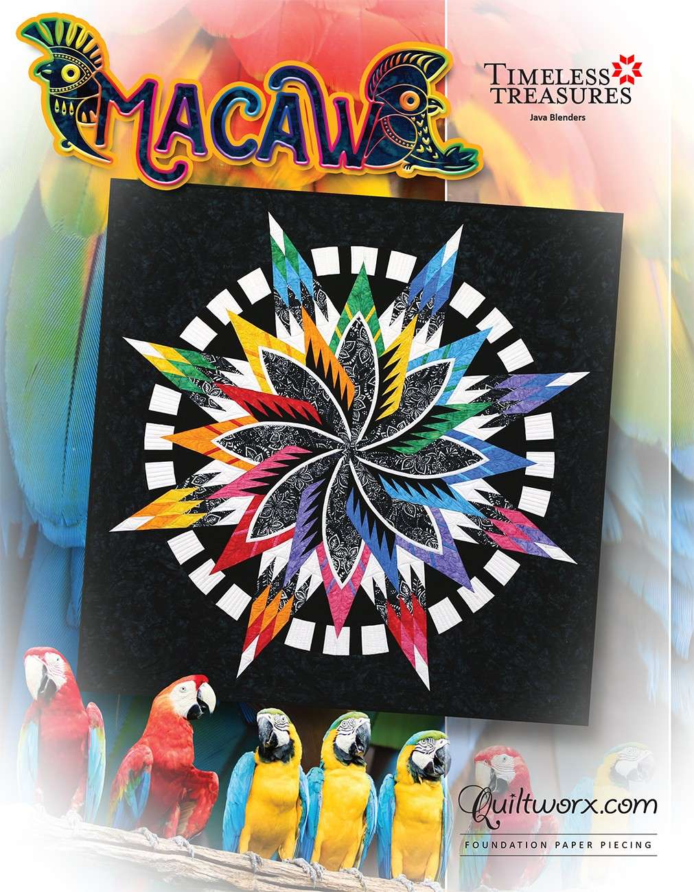 Macaw is constructed using four distinct sections: Group J is comprised of (8) center diamonds; Groups K, and L radiate out from the center star in three additional rounds of (8) star points each; and Group B is a pieced border added to the rounds to result in a 57¿-square quilt. The quilt blocks were designed by Judy and Bradley Niemeyer.