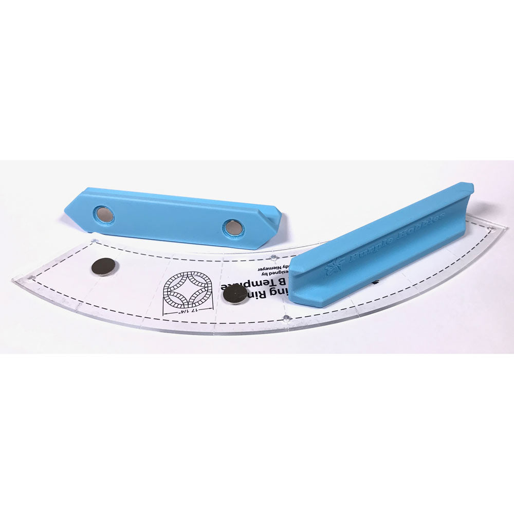 Protect your fingers from rotary blades! Position your fingers behind the ruler handle to keep them safe from rotary cutter accidents. Makes cutting with rulers fast and easy because it is so easy to lift and reposition the ruler. Magnetic Ruler Handles are removable and can be used with other rulers and templates. Four self-adhesive steel discs included to attach to your rulers. Additional self-adhesive steel discs available so you can use the handles with multiple rulers and templates. Excellent for use with longarm rulers. Sold as a set of two so you can use them together to safely trim corners.