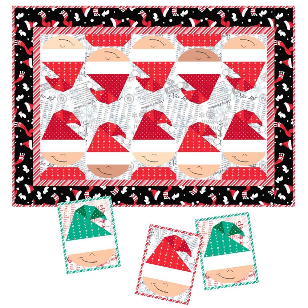 Cute elves with smirks for smiles are featured in this pattern of matching mug rugs and table runner.
