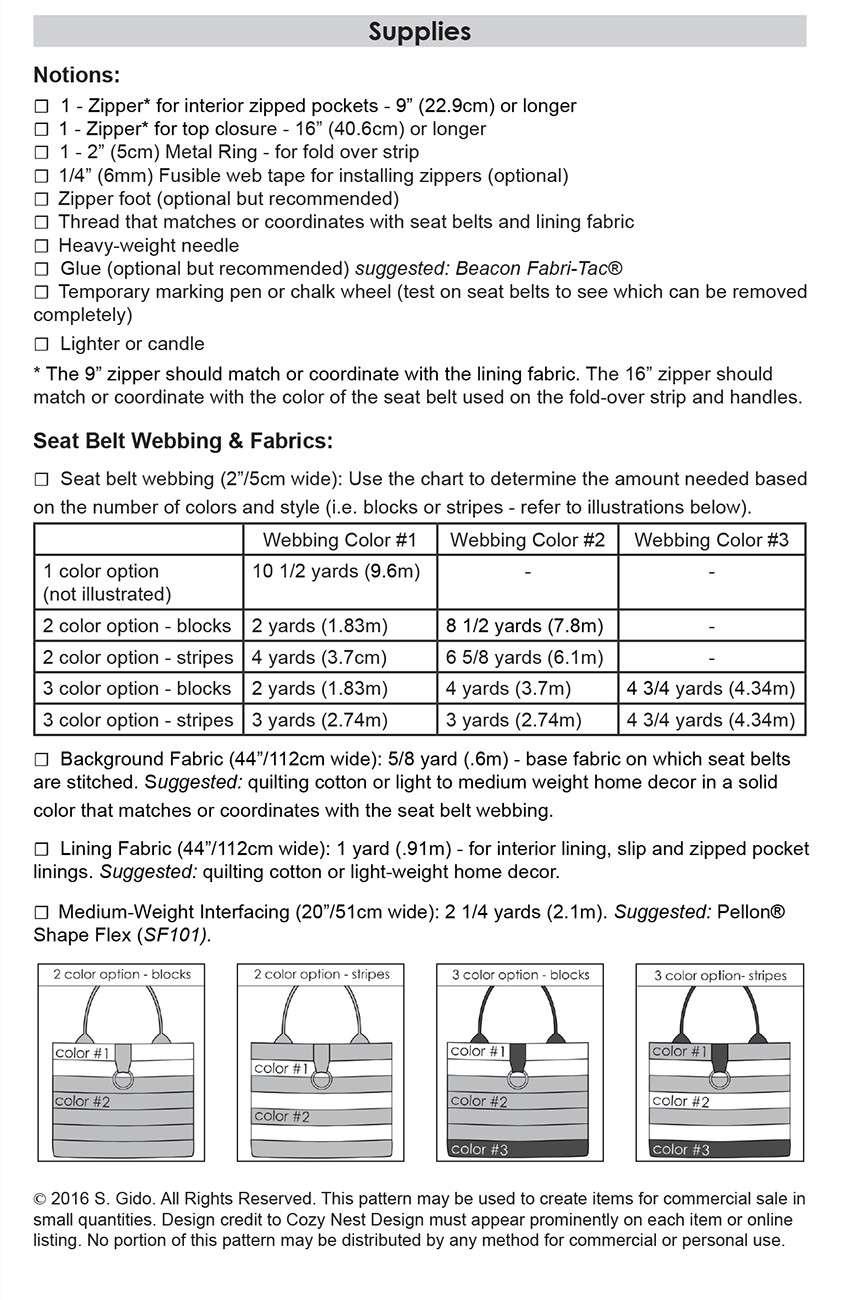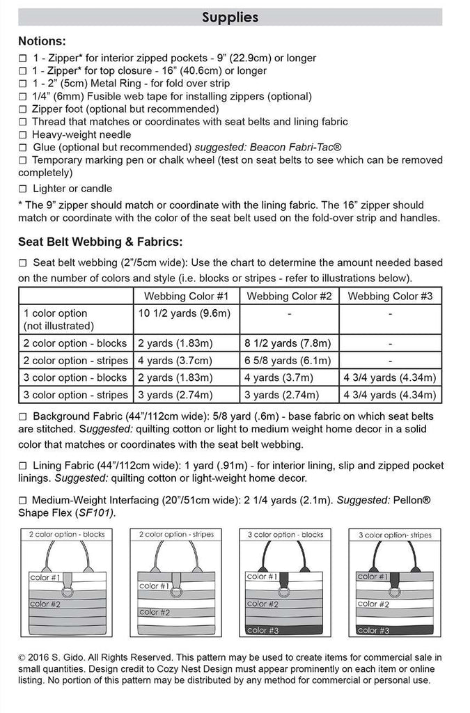 Stitch up a seat belt webbing Market Tote! This kit contains pattern, seat belt webbing, and metal ring hardware - just add fabric, interfacing and zippers. Seat belt webbing is extremely durable, easy to clean, and easy to sew on a home machine. The tote features 2 exterior slip pockets, flap accent with metal ring, zipped interior, zipped gusset closure and 23" handles. This kit is for a large size bag measuring 17" x 13" x 3 3/4" in alternating stripes of black and white.