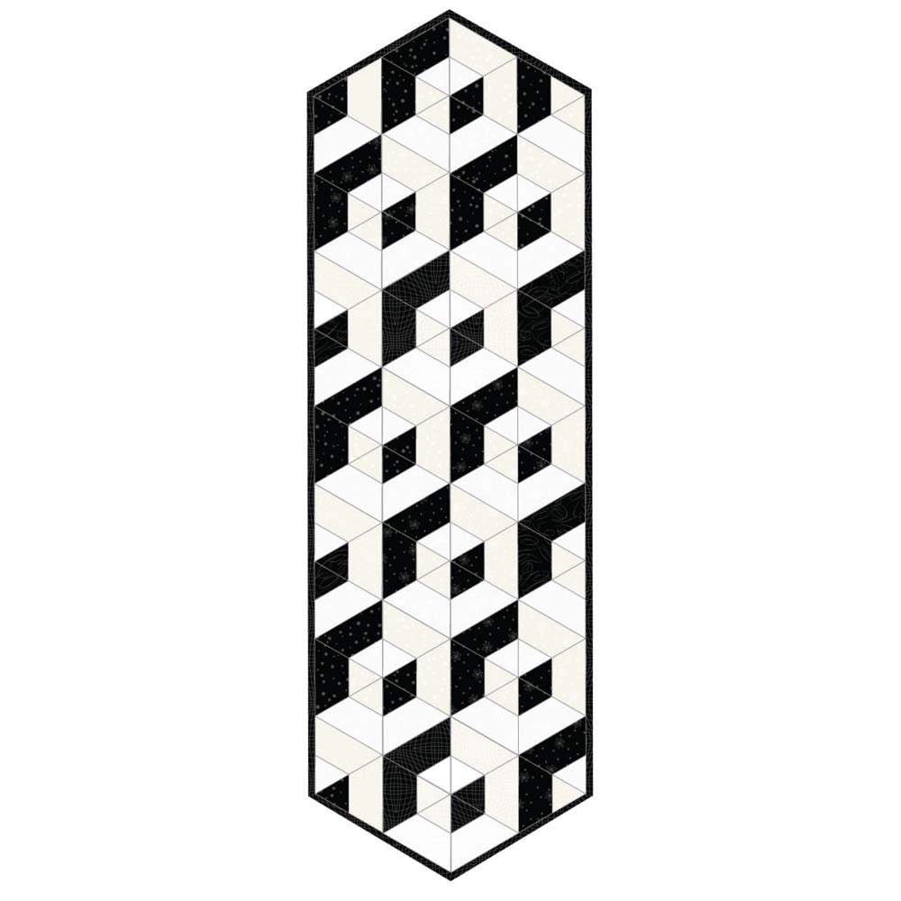 Different patterns and shapes reveal themselves as you look at this geometric design. The Solitaire Whites in Black Runner has a skill level of confident beginner.