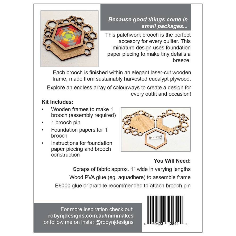 This patchwork brooch is the perfect accesory for every quilter. The miniature design uses foundation paper piecing to make tiny details a breeze. Each brooch is finished within an elegant laser-cut wooden frame, made from sustainably harvested eucalypt plywood. Explore an endless array of colourways to create one for every outfit and occasion! Finished size: 2.5"x3.5" Please note: Fabric not included Kit Includes: Wooden frames for 1 brooch (assembly required), 1 brooch pin, foundation papers for 1 brooch, instructions for foundation paper piecing and brooch construction. Requirements: Scraps of fabric approx. 1" wide in varying lengths, Wooden PVA glue, E6000 glue or araldite recommended to attach brooch pin.