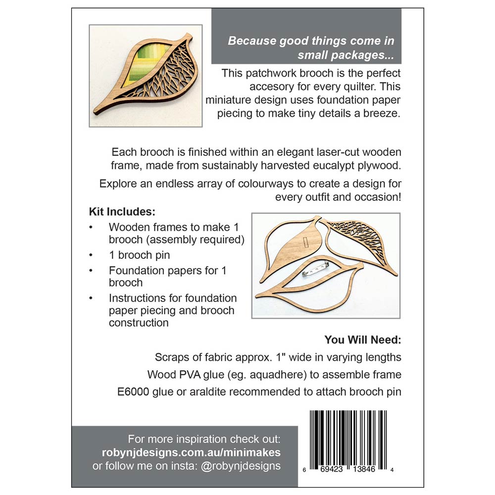 This patchwork brooch is the perfect accessory for every quilter. The miniature design uses foundation paper piecing to make tiny details a breeze. Each brooch is finished within an elegant laser-cut wooden frame, made from sustainably harvested eucalypt plywood. Explore an endless array of colorways to create one for every outfit and occasion! Finished size: 2.25"x4" Please note: Fabric not included Kit Includes: Wooden frames for 1 brooch (assembly required), 1 brooch pin, foundation papers for 1 brooch, instructions for foundation paper piecing and brooch construction. Requirements: Scraps of fabric approx. 1" wide in varying lengths, Wooden PVA glue, E6000 glue or araldite recommended to attach brooch pin.