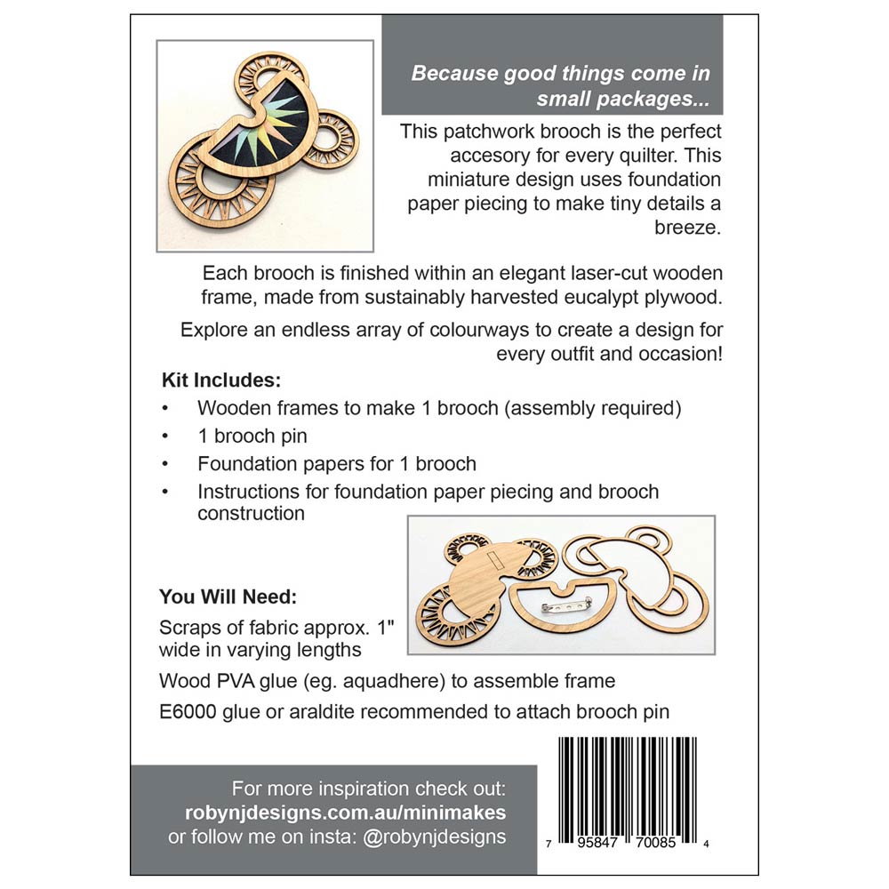 This patchwork brooch is the perfect accessory for every quilter. The miniature design uses foundation paper piecing to make tiny details a breeze. Each brooch is finished within an elegant laser-cut wooden frame, made from sustainably harvested eucalypt plywood. Explore an endless array of colorways to create one for every outfit and occasion! Finished size: 3"x2.75" Please note: Fabric not included Kit Includes: Wooden frames for 1 brooch (assembly required), 1 brooch pin, foundation papers for 1 brooch, instructions for foundation paper piecing and brooch construction. Requirements: Scraps of fabric approx. 1" wide in varying lengths, Wooden PVA glue, E6000 glue or araldite recommended to attach brooch pin.