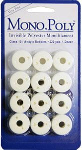 MonoPoly on prewound Class 15 (A-style) bobbins. Clear. 220 yds. per bobbin. 1 dozen bobbins per package.