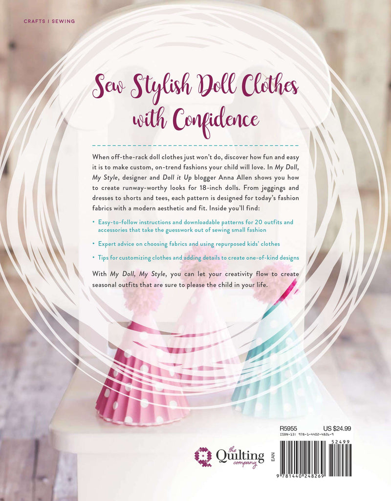 Style trends trickle down to girls' clothes, infusing their day-to-day wardrobes with edgy, fashion-forward pieces combined with age-appropriate styling. It's that line of thinking that inspires this new doll clothes collection, resulting in a must-have project book with up-to-date silhouettes and fabrics that kids gravitate towards (and infused with thumbs-up sensibility from mom.) 12+ designs with accessories ranging from fancy to out-and-about cool following today's fashion-savvy girl through a busy week! Great for all skill levels with information on sewing basics and tips on using contemporary fabrics including metallic transfers, sewing with knits, and more. My Doll, My Style is authored Anna Allen is the owner and designer of Doll It Up, a popular website dedicated to 18-doll clothes patterns and accessories. Doll It Up has established its brand, focusing on well-fitting doll clothes, simple designs for beginner/intermediate sewing, styles inspired by current fashion, and beautiful photography. 128 pages. Downloadable pattern available on page 29.