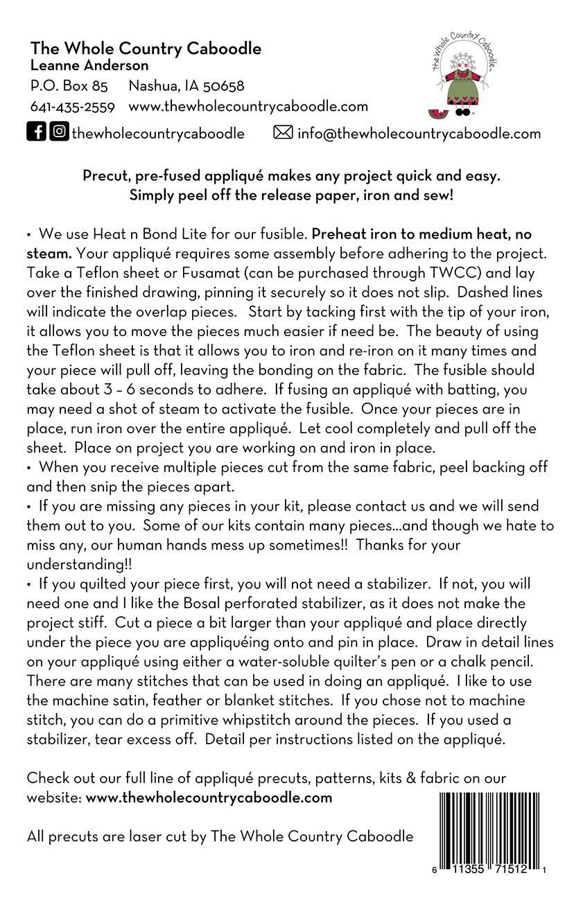 Applique fits into a 10 X 10 block. Includes precut fused applique & finished drawing for assembling applique.