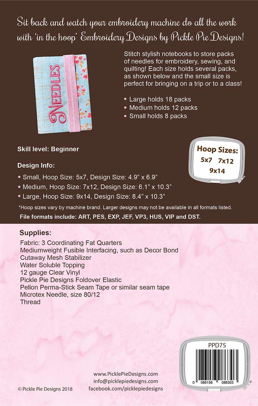 Stitch stylish notebooks to store packs of needles for embroidery, sewing, and quilting! Each size holds several packs and the small size is perfect for bringing on a trip or to a class!