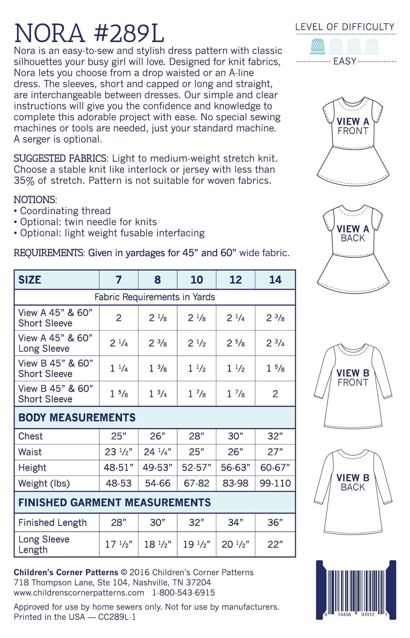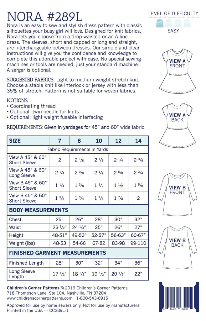 Nora is an easy-to-sew and stylish dress pattern with classic silhouettes your busy girl will love. Designed for knit fabrics, Nora lets you choose from a drop waisted or an A-line dress. The sleeves, short and capped or long and straight, are interchangeable between dresses. Our simple and clear instructions will give you the confidence and knowledge to complete this adorable project with ease. No special sewing machines or tools are needed, just your standard machine. A serger is optional. Fabric not included.